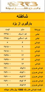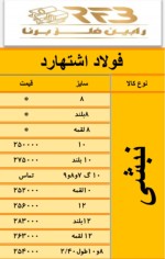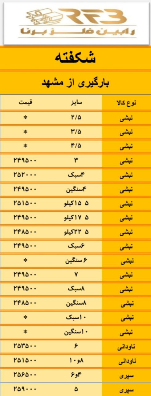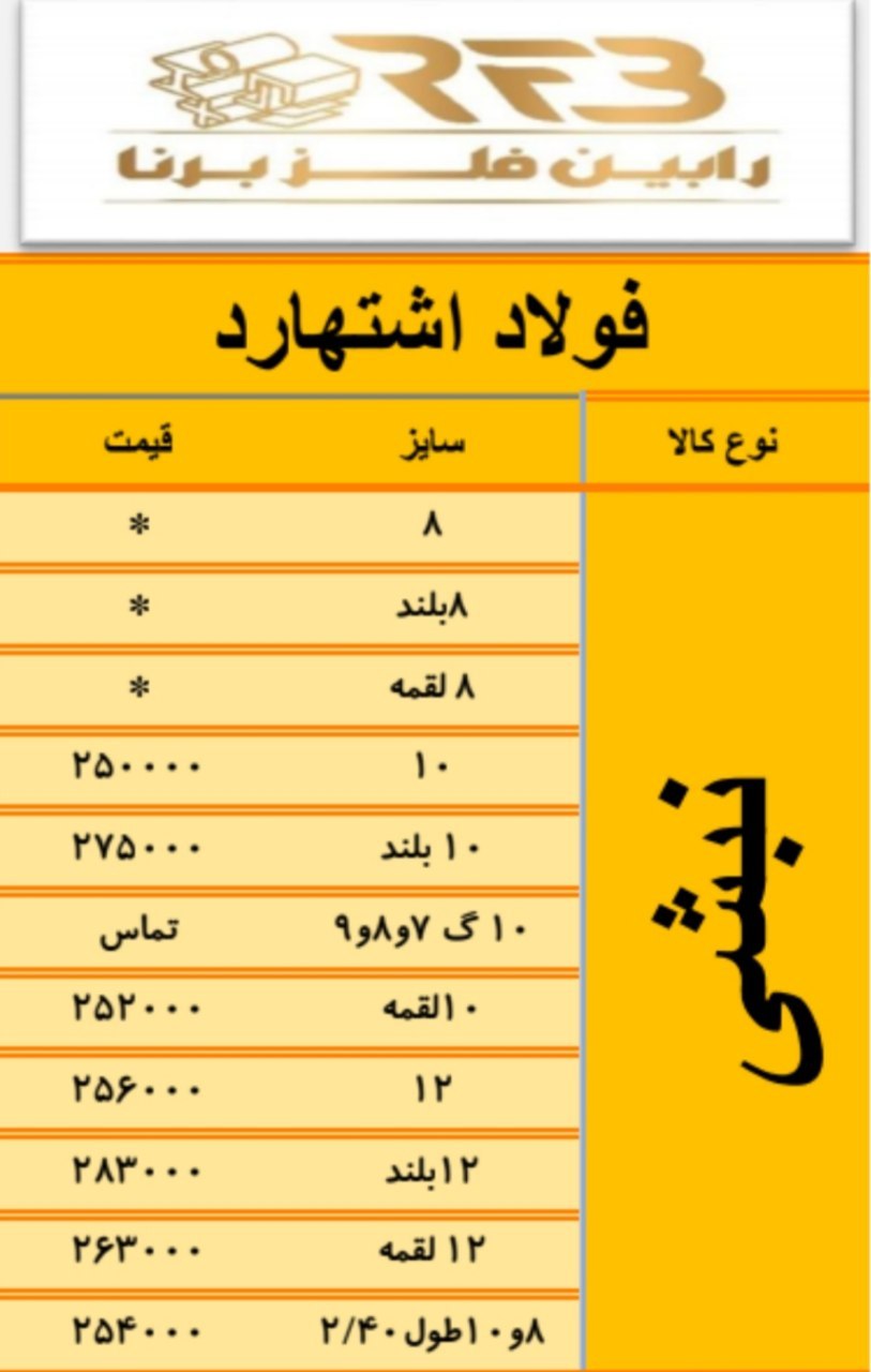توضیحات قیمت (با مالیات) چهارشنبه 1404/09/19 ساعت 13:15 تیرآهن 12 ذوب آهن 12 متری انبار تهران 10,340,000 تیرآهن 14 ذوب آهن 12 متری انبار تهران 9,950,000 تیرآهن 16 ذوب آهن 12 متری انبار تهران 11,200,000 تیرآهن 18 ذوب آهن 12 متری انبار تهران 13,040,000 تیرآهن 20 ذوب آهن 12 متری انبار تهران 23,200,000 تیرآهن 22 ذوب آهن 12 متری انبار تهران 28,850,000 تیرآهن 24 ذوب آهن 12 متری انبار تهران 33,900,000 تیرآهن 30 ذوب آهن 12 متری انبار تهران 42,900,000 تیرآهن 12 ذوب آهن بنگاه اصفهان 10,490,000 تیرآهن 14 ذوب آهن بنگاه اصفهان 10,010,000 تیرآهن 16 ذوب آهن بنگاه اصفهان 11,200,000 تیرآهن 18 ذوب آهن بنگاه اصفهان 13,110,000 تیرآهن 20 ذوب آهن بنگاه اصفهان 23,500,000 تیرآهن 22 ذوب آهن بنگاه اصفهان 28,980,000 تیرآهن 24 ذوب آهن بنگاه اصفهان 33,980,000 تیرآهن 27 ذوب آهن بنگاه اصفهان 48,000,000 تیرآهن 30 ذوب آهن بنگاه اصفهان 43,000,000 تیرآهن 12 ذوب آهن کارخانه 85,030 تیرآهن 14 ذوب آهن کارخانه 66,000 تیرآهن 16 ذوب آهن کارخانه 60,000 تیرآهن 18 ذوب آهن کارخانه 58,030 تیرآهن 20 ذوب آهن کارخانه 88,000 تیرآهن 22 ذوب آهن کارخانه 92,000 تیرآهن 24 ذوب آهن کارخانه 93,000 تیرآهن 30 ذوب آهن کارخانه 85,030 تیرآهن 14 i7 سبک ذوب آهن 12 متری 7,550,000 تیرآهن 16 i7 سبک ذوب آهن 12 متری 10,250,000 تیرآهن 18 i7 سبک ذوب آهن 12 متری 12,050,000 تیرآهن 20 i7 سبک ذوب آهن 12 متری 19,970,000 تیرآهن 16 یزد 12 متری تهران 9,400,000 تیرآهن 18 یزد 12 متری تهران 11,010,000 تیرآهن 20 یزد 12 متری تهران 15,900,000 تیرآهن 22 یزد 12 متری تهران 19,130,000 تیرآهن 24 یزد 12 متری تهران 23,840,000 تیرآهن 18 یزد 12 متری کارخانه 52,000 تیرآهن 20 یزد 12 متری کارخانه 63,000 تیرآهن 22 یزد 12 متری کارخانه 63,000 تیرآهن 24 یزد 12 متری کارخانه 67,000 تیرآهن 8 وارداتی سبک 12 متری 70 کیلوگرمی 5,730,000 تیرآهن 10 وارداتی سبک 12 متری 65 کیلوگرمی 5,730,000 تیرآهن 10 وارداتی سبک 12 متری 100 کیلوگرمی 6,000,000 تیرآهن 33 وارداتی سنگین 12 متری 110,020 تیرآهن 35 وارداتی سنگین 12 متری 105,020 تیرآهن 36 وارداتی سنگین 12 متری 120,020 تیرآهن 40 وارداتی سنگین 12 متری 120,120 تیرآهن 45 وارداتی سنگین 12 متری 120,120 تیرآهن 50 وارداتی سنگین 12 متری 119,220 تیرآهن 55 وارداتی سنگین 12 متری 121,020 تیرآهن 60 وارداتی سنگین 12 متری 125,120 📞 شماره تماس از سراسر کشور : 02186020094 شماره چهار رقمی از تهران: 1849 🌐 [لینک سایت]:https://www.digiahan.com/ 📩 کانال تلگرام : https://t.me/digiahan1849/