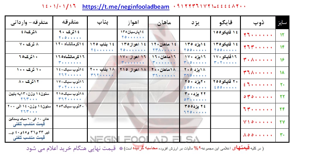🔴آهنک🔴 📆 01 فروردین 1401 فروش تیر ذوب آهن اصفهان 🏭 محل تحویل : انبار تهران 🔘12 | IPE | 2,500,000 🔘14 | IPE | 2,630,000 🔘16 | IPE | 3,060,000 🔘18 | IPE | 3,660,000 🔘20 | IPE | 4,600,000 🔘22 | IPE | 5,310,000 🔘24 | IPE | 6,270,000 🔘27 | IPE | 7,010,000 🔘30 | IPE | 8,510,000 ✔️به دلیل نوسانات بازار اعلام قیمت اجناس به صورت تلفنی میباشد. ☎️021-91006007 ( داخلی : 140 ) 🌐https://ahanak.com 📷instagram.com/ahanak.ir 🆔(http://t.me/ahanak_beam)