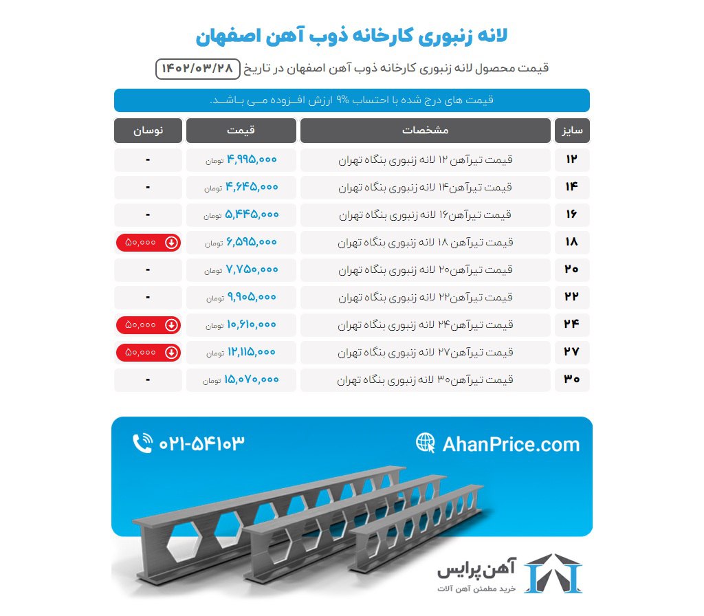 #فولاد_اهورا_مزدا (تیرآهن شهر) تیر 12 ذوب 120 کیلو 2230 تیر 14 ذوب 155 کیلو 2780 تیر 16 ذوب 190 کیلو 3370 تیر 18 ذوب 230 کیلو 3780 تیر 20 ذوب 270 کیلو 4740 تیر 22 ذوب 320 کیلو 5350 تیر 24 ذوب 370 کیلو 6840 تیر 27 ذوب 430 کیلو 7620 تیر 30 ذوب 500 کیلو 11000 ☎️02143000800 📱09121041111 🆔 @fooladahooramazda https://foolad24.com/profile/4333