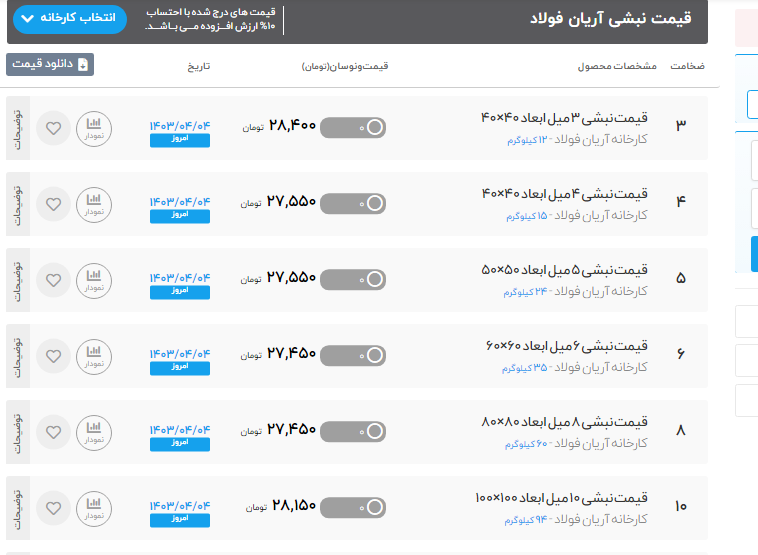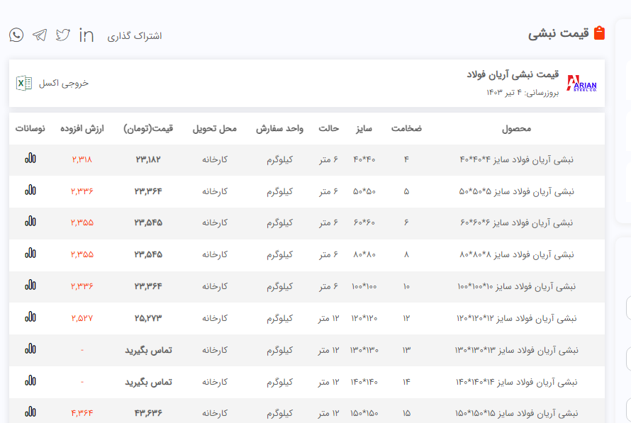 🟠 شرکت #پارس_مواد_نقش_جهان میلگرد _ آرمان آسیا 🔸میلگرد A2 سایز 10 277,000 ریال 🔸میلگرد A3 سایز 16 268,000 ریال 🔸میلگرد A3 سایز 18 268,000 ریال ——————————————- خاموت 🔹خاموت فابریک ۱۰ و ۱۲ سنجاقی و مهندسی 700+ 307,000 ریال ——————————————- تیرآهن _ ذوب آهن 🔹تیرآهن سایز ۱۲ 302,000 ریال 🔹تیرآهن سایز ۱۴ 292,000 ریال 🔹تیرآهن سایز ۱۶ 292,000 ریال 🔹تیرآهن سایز ۱۸ 292,000 ریال 🔹تیرآهن سایز ۲۰ 312,000 ریال 🔹تیرآهن سایز ۲۲ 297,000 ریال 🔹تیرآهن سایز ۲۴ 283,000 ریال 🔹تیرآهن سایز ۲۷ 283,000 ریال 🔹تیرآهن سایز ۳۰ 307,000 ریال —————————————- میلگرد _ آرین فولاد 🔹میلگرد A2 سایز 10 281,000 ریال 🔹میلگرد A2 سایز 12 🔹میلگرد A3 سایز 10 282,000 ریال 🔹میلگرد A3 سایز 12 281,000 ریال 🔹میلگرد A3 سایز 14 تا 25 277,000 ریال —————————————— نبشی _ آرین فولاد 🔹نبشی 4 گ 3 289,000 ریال 🔹نبشی 4 گ 4 280,500 ریا 🔹نبشی 7 287,500 ریال 🔹نبشی 5 -6 279,500 ریال 🔹نبشی 10 286,500 ریال 🔹نبشی 12 286,500 ریال —————————————- #جهت_مشاهده_پروفایل_پارس_مواد_نقش_جهان https://foolad24.com/profile/17737 #جهت_مشاهده_اعلام_موجودی_پارس_مواد_نقش_جهان https://foolad24.com/profile/17737/inventory 📌 تامین کننده انواع مقاطع فولادی( میلگرد، نبشی، تیرآهن، ناودانی، لوله، ورق و ...) 📎 اطلاعات تماس: 📞 031-35058 🌐 parsferro.com ✉️ info@parsferro.com 🆔 @parsferro 🧭 اصفهان، خیابان مصلی شمالی(آب ۲۵۰)، ساختمان هدی، طبقه دوم، واحد ۸