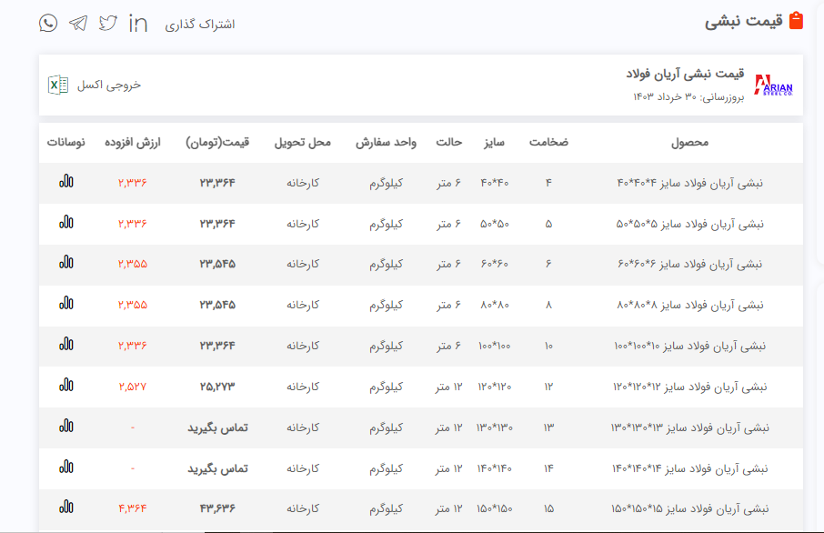 " فولاد جاوید بناب " با سلام و عرض ادب *قیمت روز چهار شنبه ۱۴۰۳/۰۳/۳۰ 🔹نبشی 40*3 سبک : ۲۹۵۰۰۰ ریال 🔹نبشی 40*3 : ۲۸۵۰۰۰ ریال 🔹نبشی 40*4 سبک : ۲۸۵۰۰۰ ریال 🔹نبشی 40*4 : ۲۸۵۰۰۰ ریال 🔹نبشی 50*3 سبک : ۲۹۵۰۰۰ ریال 🔹نبشی 50*3 : ۲۸۵۰۰۰ ریال 🔹نبشی 50*4 سبک : ۲۸۵۰۰۰ ریال 🔹نبشی 50*4 : ۲۸۵۰۰۰ ریال 🔹نبشی 50*5 سبک : ۲۸۵۰۰۰ ریال 🔹نبشی 50*5 : ۲۸۵۰۰۰ ریال 🔹نبشی 60*3 : ۲۹۵۰۰۰ ریال 🔹نبشی 60*4 : ۲۸۵۰۰۰ ریال 🔹نبشی 60*5 : ۲۸۵۰۰۰ ریال 041-37780433-6 t.me/javidsteel_bonab www.javidsteel.co Telegram فولاد جاوید بناب فولاد جاوید بناب تولیدکننده انواع نبشی ومقاطع فولادی