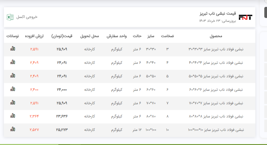 فولاد جاوید بناب 🔹نبشی 40*3 سبک : ۲۹۲۰۰۰ ریال 🔹نبشی 40*3 : ۲۸۲۰۰۰ ریال 🔹نبشی 40*4 سبک : ۲۸۲۰۰۰ ریال 🔹نبشی 40*4 : ۲۸۲۰۰۰ ریال 🔹نبشی 50*3 سبک : ۲۹۲۰۰۰ ریال 🔹نبشی 50*3 : ۲۸۲۰۰۰ ریال 🔹نبشی 50*4 سبک : ۲۸۲۰۰۰ ریال 🔹نبشی 50*4 : ۲۸۲۰۰۰ ریال 🔹نبشی 50*5 سبک : ۲۸۲۰۰۰ ریال 🔹نبشی 50*5 : ۲۸۲۰۰۰ ریال 🔹نبشی 60*3 : ۲۹۲۰۰۰ ریال 🔹نبشی 60*4 : ۲۸۲۰۰۰ ریال 🔹نبشی 60*5 : ۲۸۲۰۰۰ ریال