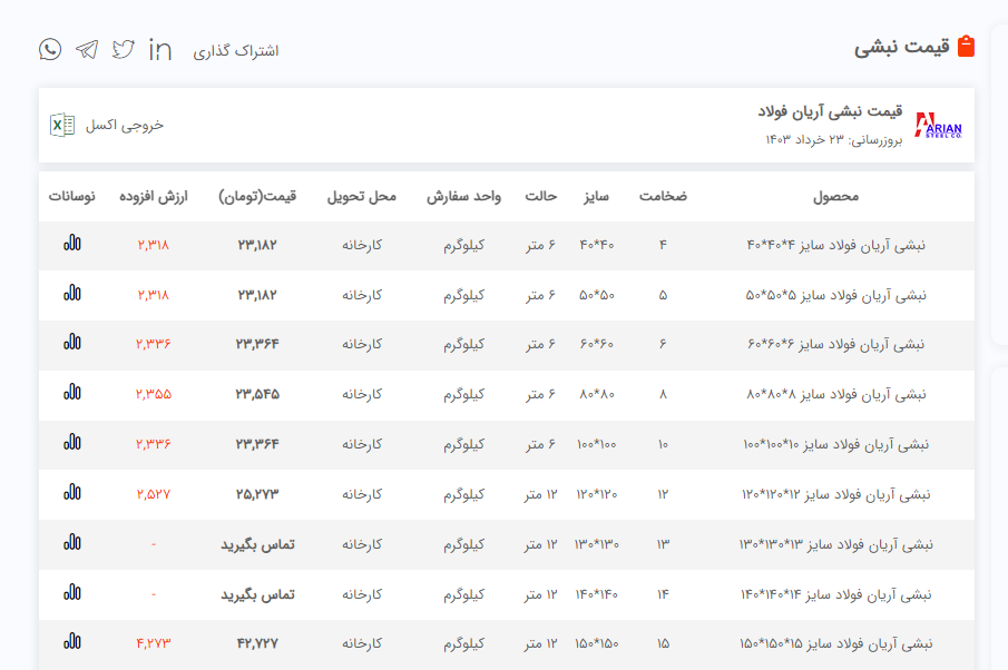 ✅ #شرکت_آسیا_فولاد_امین 🔵لیست نبشی و ناودانی🔵 ((انبار تهران)) 🔴1403/03/23🔴 #نبشی_سپهر 🔶نشی 4 گوشت 3 سپهر(۹ کیلو)📞 #نبشی_آیهان 🔶نشی ۳ گوشت ۲/۵ آیهان:📞 🔶نشی 4 گوشت 3 آیهان(۹ کیلو)📞 #نبشی_پارسه 🔶نبشی۴ گوشت۳ پارسه( 8/5 کیلو) 📞 🔶نبشی ۴ گوشت۳(۹/۵ کیلو)📞 #نبشی_ظهوریان 🔶نبشی ۳ گوشت۳ ظهوریان:📞 🔶نبشی ۴ گوشت ۳ ظهوریان:📞 🔶نبشی ۵ گوشت ۳ ظهوریان:📞 🔶نبشي ٨ گوشت ۷ ظهوریان: 📞 #نبشی_شکفته 🔶نبشی ۳ گوشت ۳ شکفته:📞 🔶نبشی ۲/۵ شکفته:📞 #نبشی_آریان_فولاد 🔶نبشی ۴ گوشت ۳ آریان فولاد:📞 🔶نبشی ۴ گوشت ۴ آریان فولاد:📞 🔶نبشی۵ گوشت ۴ آریان فولاد:📞 🔶نبشی ۵ گوشت ۵ آریان فولاد:📞 🔶نبشی ۶ گوشت ۵ آریان فولاد:📞 🔶نبشی ۶ گوشت ۶ آریان فولاد:📞 🔶نبشی ۷ گوشت ۷ آریان فولاد:📞 🔶نبشی ۸ گوشت ۸ آریان فولاد:📞 🔶نبشی ۱۰ گوشت ۱۰ آریان فولاد:📞 🔶نبشی ۱۲ گوشت ۱۲ آریان فولاد:📞 🔶نبشی ۱۵ گوشت ۱۵ آریان فولاد:📞 #نبشی_دهشير_يزد 🔶نبشی 8 گوشت 8 دهشیر یزد:📞 🔶نبشی ۱۰ گوشت ۱۰ دهشیر یزد:📞 #نبشي_لقمه 🔶نبشی لقمه ۸ * ٨ :📞 🔶نبشي لقمه ١٠* ١٠ :📞