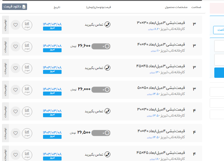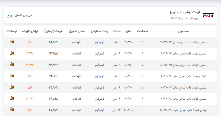 #نبشی_جاوید_بناب 📆 تاریخ ⬅️ #سه_شنبه_8_خردادماه_1403 🚚بارگیری ⬅️از کارخانه 〽️تغییرات قیمت ⬅️ #ثابت نبشی 40*40*3 سبک ⬅️ 29000 تومان نبشی 40*40*3 ⬅️ 28000 تومان نبشی 40*40*4 سبک ⬅️ 28000 تومان نبشی 40*40*4 ⬅️ 28000 تومان نبشی 50*50*3 سبک ⬅️ 29000 تومان نبشی 50*50*3 ⬅️ 28000 تومان نبشی 50*50*4 سبک ⬅️ 28000 تومان نبشی 50*50*4 ⬅️ 28000 تومان نبشی 50*50*5 سبک ⬅️ 28000 تومان نبشی 50*50*5 ⬅️ 28000 تومان نبشی 60*60*3 ⬅️ 29000 تومان نبشی 60*60*4 ⬅️ 28000 تومان نبشی 60*60*5 ⬅️ 28000 تومان ❗️تمامی قیمت ها با احتساب 10% مالیات بر ارزش افزوده می باشد. ☑️ برای مشاوره و راهنمایی در مورد خرید لطفا با ما تماس بگیرید . ☎️ 02146132136 ☎️ 02146135390 📱09122887687 📱09107678174 🆔 @tgfonline 🌐 www.tarazfoolad.ir