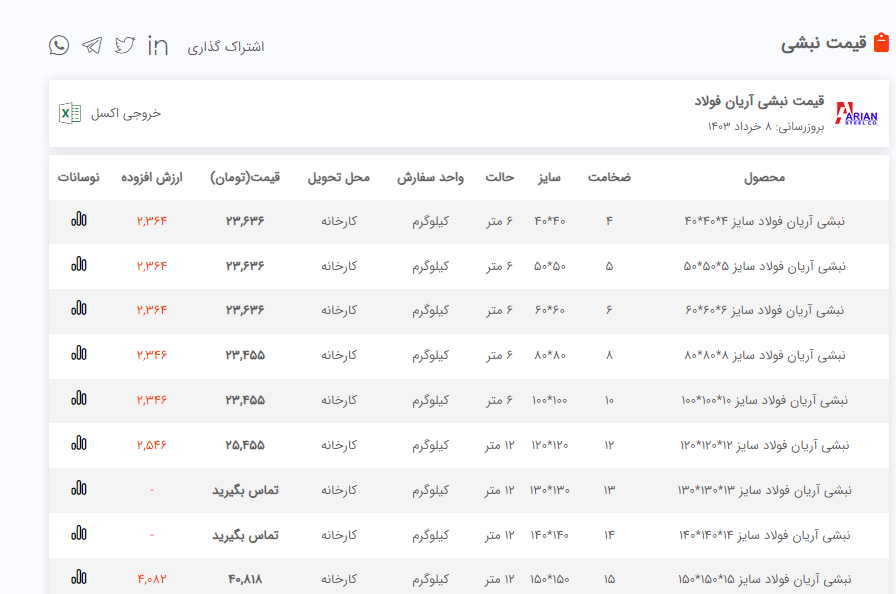 ✅ #شرکت_آسیا_فولاد_امین 🔵لیست نبشی و ناودانی🔵 ((انبار تهران)) 🔴1403/03/08🔴 #نبشی_سپهر 🔶نشی ۳ گوشت ۲/۵ سپهر:📞 #نبشی_آیهان 🔶نشی ۳ گوشت ۲/۵ آیهان:📞 #نبشي_اشتهارد 🔶نبشي 12 گوشت 12 اشتهارد:📞 🔶نبشی ۱۰ گوشت ۱۰ اشتهارد: 📞 #نبشی_پارسه 🔶نبشی ۴ گوشت ۳ پارسه : 📞 🔶نبشی ۴ گوشت ۴ پارسه : 📞 #نبشی_ظهوریان 🔶نبشی ۳ گوشت۳ ظهوریان:📞 🔶نبشی ۴ گوشت ۳ ظهوریان:📞 🔶نبشی ۵ گوشت ۳ ظهوریان:📞 🔶نبشي ٨ گوشت ۷ ظهوریان: 📞 #نبشی_شکفته 🔶نبشی ۳ گوشت ۳ شکفته:📞 🔶نبشی ۲/۵ شکفته:📞 #نبشی_آریان_فولاد 🔶نبشی ۴ گوشت ۳ آریان فولاد:📞 🔶نبشی ۴ گوشت ۴ آریان فولاد:📞 🔶نبشی۵ گوشت ۴ آریان فولاد:📞 🔶نبشی ۵ گوشت ۵ آریان فولاد:📞 🔶نبشی ۶ گوشت ۵ آریان فولاد:📞 🔶نبشی ۶ گوشت ۶ آریان فولاد:📞 🔶نبشی ۷ گوشت ۷ آریان فولاد:📞 🔶نبشی ۸ گوشت ۸ آریان فولاد:📞 🔶نبشی ۱۰ گوشت ۱۰ آریان فولاد:📞 🔶نبشی ۱۲ گوشت ۱۲ آریان فولاد:📞 🔶نبشی ۱۵ گوشت ۱۵ آریان فولاد:📞 #نبشی_دهشير_يزد 🔶نبشی 8 گوشت 8 دهشیر یزد:📞 🔶نبشی ۱۰ گوشت ۱۰ دهشیر یزد:📞 #نبشي_لقمه 🔶نبشی لقمه ۸ * ٨ :📞 🔶نبشي لقمه ١٠* ١٠ :📞