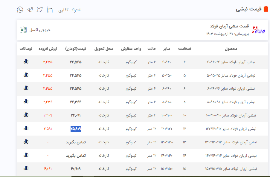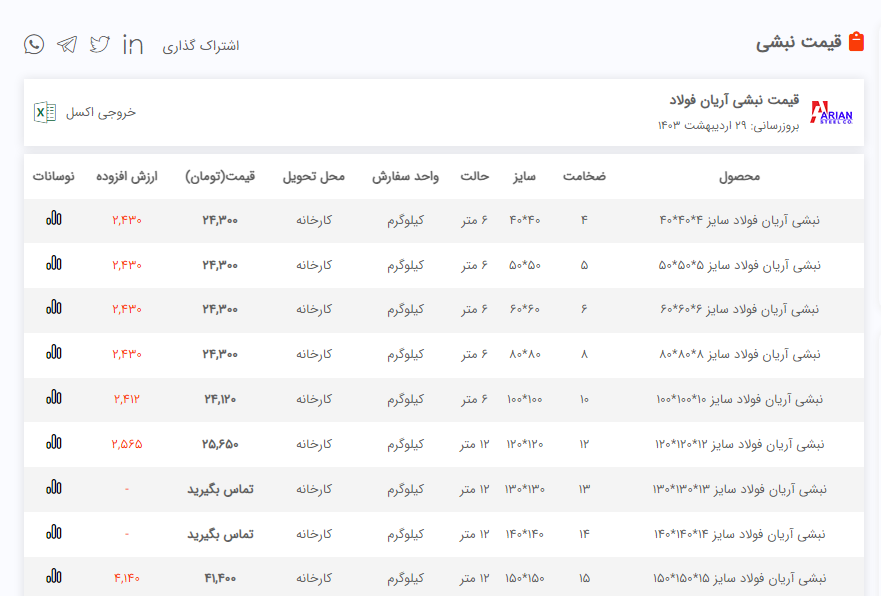 📢#نبشی_جاوید_بناب 🗓یکشنبه 1403/02/30 🚛بارگیری #کارخانه 🔸ثابت نبشی 3*40 سبک ↔️ 29200 تومان نبشی 3*40 ↔️ 28200 تومان ✅ مشاهده ادامه لیست قیمت ها: ahanlands.com/manufacturer/جاوید-بناب/ 🔴فروش با تایید موجودی قیمت می باشد🔴 🔴 قیمت نهایی هنگام اخذ آدرس 🔴 ✅ جهت خرید، مشاوره و ارتباط با کارشناسان فروش: https://zil.ink/ahanland ☎️ 021 910 10 666 ☎️ 061 53 222 100 🆔 @ahanland