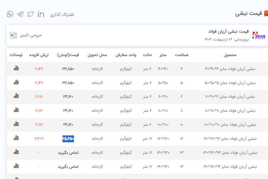 ✅ #شرکت_آسیا_فولاد_امین 🔵لیست نبشی و ناودانی🔵 ((انبار تهران)) 🔴1403/02/29🔴 #نبشی_سپهر 🔶نشی ۳ گوشت ۲/۵ سپهر:📞 #نبشی_آیهان 🔶نشی ۳ گوشت ۲/۵ آیهان:📞 #نبشي_اشتهارد 🔶نبشي 12 گوشت 12 اشتهارد:📞 🔶نبشی ۱۰ گوشت ۱۰ اشتهارد: 📞 #نبشی_پارسه 🔶نبشی ۴ گوشت ۳ پارسه : 📞 🔶نبشی ۴ گوشت ۴ پارسه : 📞 #نبشی_ظهوریان 🔶نبشی ۳ گوشت۳ ظهوریان:📞 🔶نبشی ۴ گوشت ۳ ظهوریان:📞 🔶نبشی ۵ گوشت ۳ ظهوریان:📞 🔶نبشي ٨ گوشت ۷ ظهوریان: 📞 #نبشی_شکفته 🔶نبشی ۳ گوشت ۳ شکفته:📞 🔶نبشی ۲/۵ شکفته:📞 #نبشی_آریان_فولاد 🔶نبشی ۴ گوشت ۳ آریان فولاد:📞 🔶نبشی ۴ گوشت ۴ آریان فولاد:📞 🔶نبشی۵ گوشت ۴ آریان فولاد:📞 🔶نبشی ۵ گوشت ۵ آریان فولاد:📞 🔶نبشی ۶ گوشت ۵ آریان فولاد:📞 🔶نبشی ۶ گوشت ۶ آریان فولاد:📞 🔶نبشی ۷ گوشت ۷ آریان فولاد:📞 🔶نبشی ۸ گوشت ۸ آریان فولاد:📞 🔶نبشی ۱۰ گوشت ۱۰ آریان فولاد:📞 🔶نبشی ۱۲ گوشت ۱۲ آریان فولاد:📞 🔶نبشی ۱۵ گوشت ۱۵ آریان فولاد:📞 #نبشی_دهشير_يزد 🔶نبشی 8 گوشت 8 دهشیر یزد:📞 🔶نبشی ۱۰ گوشت ۱۰ دهشیر یزد:📞 #نبشي_لقمه 🔶نبشی لقمه ۸ * ٨ :📞 🔶نبشي لقمه ١٠* ١٠ :📞