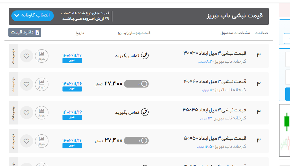 اعلام موجودی نبشی آهن یاب ❇️ لیست کالای فولاد ناب تبریز : 📅 دوشنبه : ۱۴۰۲/۱۱/۱۶ (ثبات قیمت) ♦️ نبشی ۴*۴ 💵27350 تومان ♦️نبشی ۵*۵ 💵27250 تومان ♦️ نبشی۶*۶ 💵27050 تومان ♦️نبشی ۷*۷ 💵27250 تومان
