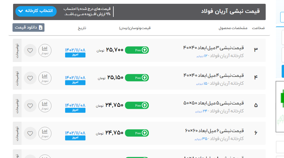 اعلام موجودی نبشی آهن یاب ❇️ لیست کالای نبشی نورد آریان فولاد: 📅 یکشنبه : ۱۴۰۲/۱۱/۸ (افزایش قیمت) ♦️نبشی ۴*۴ 💵 25300 تومان 📈 200 ♦️نبشی۵*۵ 💵24900 تومان 📈 200 ♦️ نبشی 6*6 💵24900 تومان 📈 200 ♦️ نبشی ۷*۷ 💵25400 تومان 📈 200 ♦️نبشی ۸*۸ 💵24900 تومان 📈 200