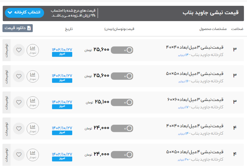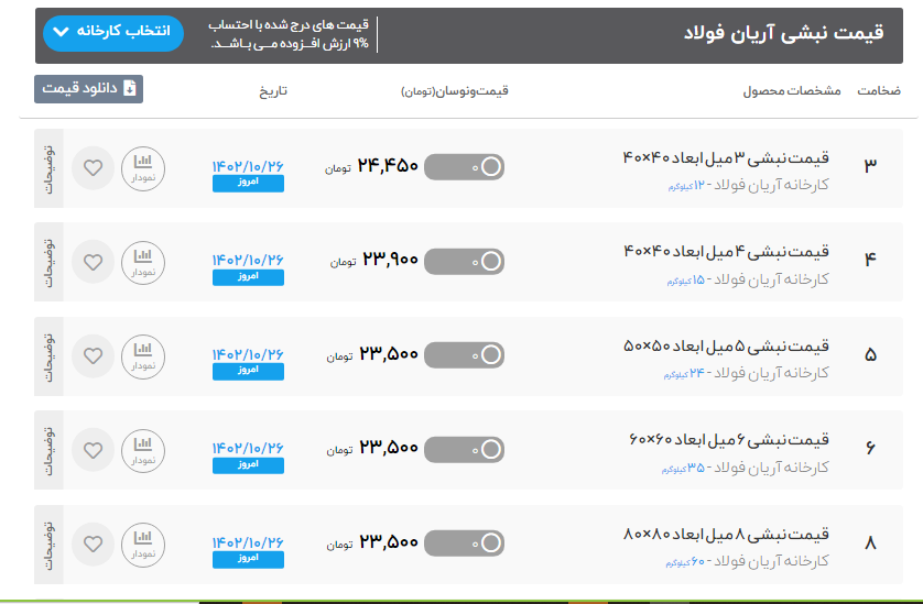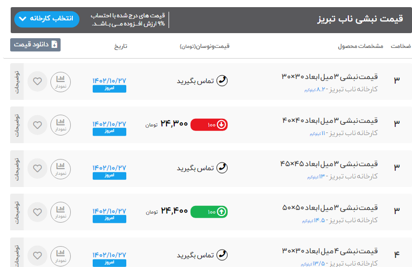 اعلام موجودی نبشی آهن یاب لیست کالای نبشی نورد آریان فولاد: 📅 سه شنبه : ۱۴۰۲/۱۰/۲۶ (افزایش قیمت) ♦️نبشی ۴*۴ 💵 24000 تومان 📈 50 ♦️نبشی۵*۵ 💵23600 تومان 📈 50 ♦️ نبشی ۷*۷ 💵23600 تومان 📈 50 ♦️نبشی ۸*۸ 💵23600 تومان 📈 50 ♦️نبشی ۱۰*۱۰ 💵24150 تومان 📈 50