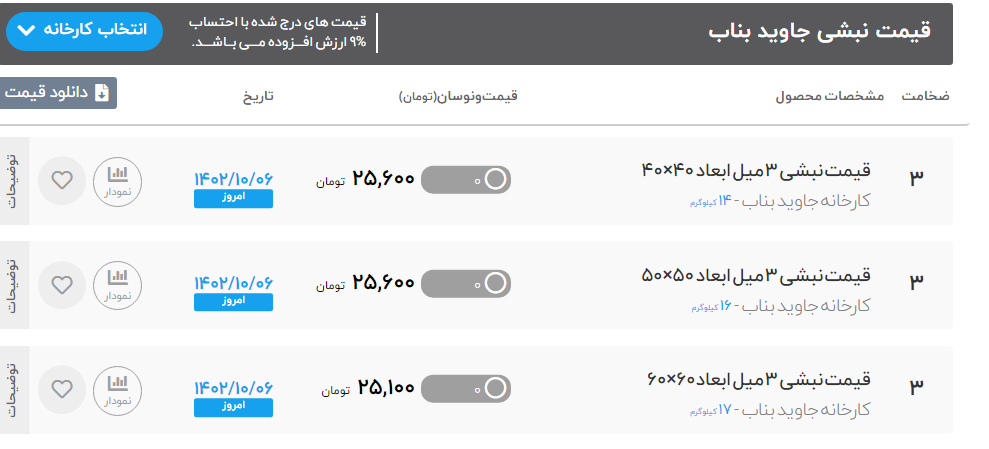 اعلام موجودی نبشی آهن یاب ❇️ لیست کالای فولاد ناب تبریز : 📅 سه شنبه : ۱۴۰۲/۱۰/۵ (ثبات قیمت) ♦️ نبشی ۴*۴ 💵23750 تومان ♦️نبشی ۵*۵ 💵23450 تومان ♦️ نبشی۶*۶ 💵23450 تومان