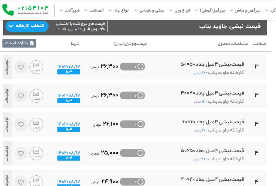 #قیمت #نبشی #سپهر_ایرانیان #کارخانه 🌎 چهارشنبه 17 آبان ماه 1402 🌎 طول:6متر نبشی30*30 ضخامت 3 ⏪ 244000 ریال نبشی40*40 ضخامت 3 ⏪ 245000 ریال نبشی40*40 ضخامت 4 ⏪ 246000 ریال نبشی50*50 ضخامت 3 ⏪ 248000 ریال نبشی50*50 ضخامت 4 ⏪ 246000 ریال نبشی50*50 ضخامت 5 ⏪ 246000 ریال نبشی60*60 ضخامت 4 ⏪ 255000 ریال نبشی60*60 ضخامت 5 ⏪ 248000 ریال نبشی60*60 ضخامت 6 ⏪ 248000 ریال نبشی80*80 ضخامت 8 ⏪ 243000 ریال نبشی100*100 ضخامت 10 ⏪ 243000 ریال نبشی120*120 ضخامت 12 ⏪ 250000 ریال ✅تهران آهن خریدی امن,آسان,ارزان ✅کارشناس فروش : آقای قاجار 🔴 مشاهده قیمت نبشی 🔴 ⚙️برای مشاهده کامل جدول قیمت نبشی می توانید به سایت تهران آهن مراجعه کنید: ✅(50 خط ویژه): ☎️021-86073000 📱 instagram.com/tehran.ahan 🌏 https://b2n.ir/z24424 🔗 t.me/Tehran_ahan