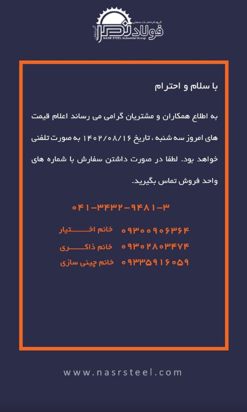 🌹 گروه کارخانجات #فولاد_نصر_آذربایجان 🔴تولید کننده انواع ناودانی ، نبشی و تیرآهن با استاندارد های روز دنیا 🔴صادر کننده نمونه استانی #جهت_مشاهده_پروفایل_فولاد_نصر_آذربایجان👇🏻 🔴https://foolad24.com/profile/12247 #جهت_مشاهده_اعلام_موجودی_فولاد_نصر_آذربایجان https://foolad24.com/profile/12247/inventory 📍آدرس کارخانه : تبریز ، جاده آذرشهر ، شهرک صنعتی سلیمی 🔴تلفن های دپارتمان فروش: ☎️04134329481 ☎️04134329482 ☎️04134329483 📱09129308689 📱09144199362 🆔https://t.me/NasrsteelAZ 🔴https://www.instagram.com/nasrsteel 🌐nasrsteel.com