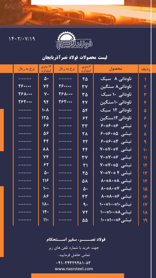 ✅ #شرکت_آسیا_فولاد_امین 🔵لیست نبشی و ناودانی🔵 ((انبار تهران)) 🔴1402/07/19🔴 #نبشی_سپهر 🔶نشی ۳ گوشت ۲/۵ سپهر:📞 #نبشی_آیهان 🔶نشی ۳ گوشت ۲/۵ آیهان:📞 #نبشي_اشتهارد 🔶نبشي ٤ گوشت ۳ اشتهارد:📞 🔶نبشی ۱۰ گوشت ۱۰ اشتهارد: 📞 #نبشی_پارسه 🔶نبشی ۴ گوشت ۳ پارسه : 📞 🔶نبشی ۴ گوشت ۴ پارسه : 📞 #نبشی_ظهوریان 🔶نبشی ۳ گوشت۳ ظهوریان:📞 🔶نبشی ۴ گوشت ۳ ظهوریان:📞 🔶نبشی ۵ گوشت ۳ ظهوریان:📞 🔶نبشي ٨ گوشت ۷ ظهوریان: 📞 #نبشی_شکفته 🔶نبشی ۳ گوشت ۳ شکفته:📞 🔶نبشی ۲/۵ شکفته:📞 #نبشی_آریان_فولاد 🔶نبشی ۴ گوشت ۳ آریان فولاد:📞 🔶نبشی ۴ گوشت ۴ آریان فولاد:📞 🔶نبشی۵ گوشت ۴ آریان فولاد:📞 🔶نبشی ۵ گوشت ۵ آریان فولاد:📞 🔶نبشی ۶ گوشت ۵ آریان فولاد:📞 🔶نبشی ۶ گوشت ۶ آریان فولاد:📞 🔶نبشی ۷ گوشت ۷ آریان فولاد:📞 🔶نبشی ۸ گوشت ۸ آریان فولاد:📞 🔶نبشی ۱۰ گوشت ۱۰ آریان فولاد:📞 🔶نبشی ۱۲ گوشت ۱۲ آریان فولاد:📞 🔶نبشی ۱۵ گوشت ۱۵ آریان فولاد:📞 #نبشی_دهشير_يزد 🔶نبشی ۱۰ گوشت ۱۰ دهشیر یزد:📞 #نبشي_لقمه 🔶نبشی لقمه ۸ * ٨ :📞 🔶نبشي لقمه ١٠* ١٠ :📞