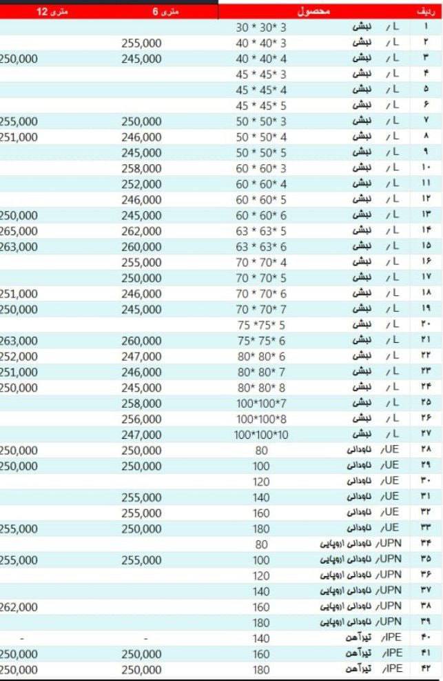 📌 پروفیل سبک 342,000📌پروفیل سنگین 337,000📌 ستونی 325,000📌ناودانی۸و۱۰ سبک 268,000📌ناودانی۸تا۱۶سنگین 268,000📌ناودانی ۱۸ 268,000📌نبشی۳-۳/۴میل 262,000📌نبشی۴-۳میل 262,000📌نبشی۴-۴میل 260,000📌نبشی۵-۵/۴میل 247,000📌نبشی۶-۵/۶میل 247,000📌نبشی۸-۸میل 247,000📌نبشی۱۰-۱۰میل 250,000 ✅ انبار اصفهان؛بارگیری سریع