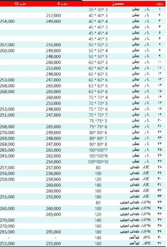 ۴۰۲/۰۵/۰۳ 🗓◻️استعلام قیمت فقط از طریق تماس تلفنی🔵موجودی نبشی انبار تهران 🔹نبشی ۳ اسپیرال اصفهان ( ۸ ك) 🔹نبشی ۳ شکفته سنگین ( ۸ ك) 🔹نبشی ۳ آی هان تهران ( ۷ ك) .................................................. 🔹نبشی ۴ اسپیرال اصفهان ( ۱۴ ك) 🔹نبشی ۴ شکفته ( ۱۰/۵ ك) 🔹نبشی ۴ فولاد پارسه ( ۹ ك) 🔹نبشی ۴ فولاد سپهر ( ۱۰ ك) 🔹نبشی ۴ ابهر ( ۱۴ ك) .................................................. 🔹نبشی ۵ گ۳ ظهوریان ( ۱۵ ك) 🔹نبشی ۵ گ۵ زنجان ( ۲۲ ك) 🔹نبشی ۵ ناب تبریز ( ۲۲ ك) 🔹نبشی ۵ گ ۴ ناب تبریز ( ۱۸ ك) 🔹نبشی ۵ گ۴ زنجان ( ۱۸ ك) .................................................. 🔹نبشی ۶ زنجان ( ۳۱ ك) 🔹نبشی ۶ گ۴ زنجان ( ۲۳ ك) 🔹نبشی ۶ گ۵ زنجان ( ۲۷ ك) 🔹نبشی ۶ ناب تبریز ( ۳۲ ك) .................................................. 🔹نبشی ۷ آریان فولاد ( ۴۴ ك) 🔹نبشی ۷ ناب تبریز ( ۴۲ ك) .................................................. 🔹نبشی ۸ آریان فولاد ( ۵۶ ك) 🔹نبشی ۸ فولاد اشتهارد ( ۵۶ ك) 🔹نبشی ۸ گ۷ شکفته ( ۵۰ ك) .................................................. 🔹نبشی ۱۰ شکفته ( ۸۰ ك) 🔹نبشی ۱۰ آریان فولاد ( ۸۸ ك) 🔹نبشی۱۰ اشتهارد ( ۸۶ ك) 🔹نبشی۱۰ گ۸ اشتهارد ( ۷۵ ك) .................................................. 🔹نبشی ۱۲ آریان فولاد ( ۱۳۳ ك) 🔹نبشی ۱۲ مگا استیل ( ۱۲۹ ك) .................................................. 🔹نبشی ۹ آریان فولاد (بلند) 🔹نبشی ۱۴ آریان فولاد (بلند) 🔹نبشی ۱۵ آریان فولاد (بلند) 🔹نبشی ۲۰ آریان فولاد (بلند) ..................................................موجودی سپری انبار تهران🔹سپری ۳ نورد آسمان ( ۱۰ ك) 🔹سپری ۴ نوردآسمان ( ۱۵ ك) 🔹سپری ۴ شکفته ( ۱۵ ك) 🔹سپری ۵ نورد آسمان ( ۲۰ ك ) 🔹سپری ۵ شکفته ( ۲۱ ك) 🔹سپری ۶ نورد آسمان ( ۲۶ ك) 🔹سپری ۶ شکفته ( ۲۵ ك)