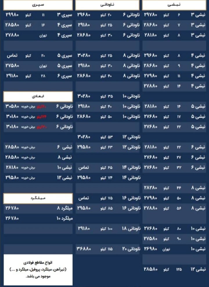 آرمان گستر اقتدار (آهن آرمان) 👈ضمانت یک خرید مطمئن👉 #قیمت روز انواع #نبشی #نبشی_استاندارد 🗓 دوشنبه، 08 خرداد 1402 🗓 . 📢 قیمت روز نبشی استاندارد، 6 متری 📢 🔸 نبشی سایز 2x2x2 (شاخه 4.5کیلویی): 560.000 ريال 🔸 نبشی سایز 2x2x3 (شاخه 5.5کیلویی): ء call 🔸 نبشی سایز 2.5x2.5x2 (شاخه 5.5کیلویی): ء call 🔸 نبشی سایز 2.5x2.5x3 (شاخه 7کیلویی): 295.000 ریال 🔸 نبشی سایز 3x3x2 (شاخه 7کیلویی): 285.000 ريال 🔸 نبشی سایز 3x3x3 (شاخه 9کیلویی): 290.000 ریال 🔸 نبشی سایز 4x4x2 (شاخه 10کیلویی): 300.000 ریال 🔸 نبشی سایز 4x4x3 (شاخه 12کیلویی): 285.000 ریال 🔸 نبشی سایز 4x4x4 (شاخه 15کیلویی): 276.000 ریال 🔸 نبشی سایز 5x5x3 (شاخه 16کیلویی): 276.000 ریال 🔸 نبشی سایز 5x5x4 (شاخه 19کیلویی): 276.000 ریال 🔸 نبشی سایز 5x5x5 (شاخه 23کیلویی): 276.000 ریال 🔸 نبشی سایز 6x6x4 (شاخه 24کیلویی): 276.000 ریال 🔸 نبشی سایز 6x6x5 (شاخه 28کیلویی): 276.000 ریال 🔸 نبشی سایز 6x6x6 (شاخه 33کیلویی): 276.000 ریال 🔸 نبشی سایز 7x7x4 (شاخه 29کیلویی): ء call 🔸 نبشی سایز 7x7x5 (شاخه 33کیلویی): ء call 🔸 نبشی سایز 7x7x6 (شاخه 37کیلویی): 300.000 ریال 🔸 نبشی سایز 7x7x7 (شاخه 42کیلویی): 280.000 ریال 🔸 نبشی سایز 8x8x6 (شاخه 49کیلویی): ء call 🔸 نبشی سایز 8x8x8 (شاخه 58کیلویی): 275.000 ریال 🔸 نبشی سایز 10x10x8 (شاخه 74کیلویی): ء call 🔸 نبشی سایز 10x10x10 (شاخه 88کیلویی): 270.000 ریال 🔸 نبشی سایز 12x12x12 (شاخه 124کیلویی): 285.000 ریال ~~~~~~~~~~~~~~~~~~ 📢 قیمت روز نبشی استاندارد، 12 متری 📢 🔸 نبشی سایز 7x7x6 (شاخه 74کیلویی): ء call 🔸 نبشی سایز 7x7x7 (شاخه 84کیلویی): ء call 🔸 نبشی سایز 8x8x6 (شاخه 90کیلویی): ء call 🔸 نبشی سایز 8x8x7 (شاخه 98کیلویی): 300.000 ریال 🔸 نبشی سایز 8x8x8 (شاخه 116کیلویی): 300.000 ریال 🔸 نبشی سایز 9x9x7 (شاخه 113کیلویی): 380.000 ریال 🔸 نبشی سایز 9x9x8 (شاخه 129کیلویی): 380.000 ریال 🔸 نبشی سایز 9x9x9 (شاخه 142کیلویی): 380.000 ريال 🔸 نبشی سایز 10x10x7 (شاخه 130کیلویی): 380.000 ریال 🔸 نبشی سایز 10x10x8 (شاخه 156کیلویی): 360.000 ریال 🔸 نبشی سایز 10x10x10 (شاخه 176کیلویی): 315.000 ریال 🔸 نبشی سایز 12x12x10 (شاخه 212کیلویی): 360.000 ریال 🔸 نبشی سایز 12x12x12 (شاخه 248کیلویی): 360.000 ریال 🔸 نبشی سایز 14x14x12 (شاخه 299کیلویی): 440.000 ریال 🔸 نبشی سایز 14x14x14 (شاخه 350کیلویی): 440.000 ریال 🔸 نبشی سایز 15x15x12 (شاخه 324کیلویی): 440.000 ریال 🔸 نبشی سایز 15x15x15 (شاخه 400کیلویی): 400.000 ریال 🔸 نبشی سایز 16x16x14 (شاخه 400کیلویی): 440.000 ریال 🔸 نبشی سایز 16x16x16 (شاخه 450کیلویی): 550.000 ریال 🔸 نبشی سایز 18x18x18 (شاخه 570کیلویی): ء call 🔸 نبشی سایز 20x20x20 (شاخه 700کیلویی): 550.000 ریال ~~~~~~~~~~~~~~~~~~ ☎️۰۲۱-۵۸۳۳۶ داخلی 115 خانم گل پرور 🌐www.ahanarman.com وب سایت @AhanArmanPrice🆔 کانال قیمت روز تلگرام