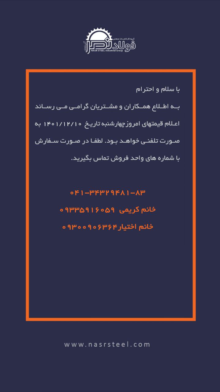 گروه کارخانجات #فولاد_نصر_آذربایجان📌تولید کننده انواع ناودانی ، نبشی و تیرآهن با استاندارد های روز دنیا 📌صادر کننده نمونه استانی📍آدرس کارخانه : تبریز ، جاده آذرشهر ، شهرک صنعتی سلیمی📌تلفن های دپارتمان فروش:☎️04134329481 ☎️04134329482 ☎️04134329483 📱09129308689 📱09144199362🆔https://t.me/NasrsteelAZ 📌https://www.instagram.com/nasrsteel 🌐nasrsteel.com https://foolad24.com/profile/12247