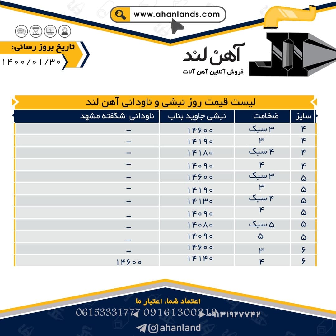 🔴آهن لند🔴 ⭕لیست قیمت انواع محصولات فولادی در تاریخ: 1400/01/30 برای مشاهده آنلاین قیمت انواع مقاطع فولادی به وب سایت WWW.AHANLANDS.COM مراجعه فرمایید. ⚜اعتماد شما اعتبار ماست⚜ ارتباط با کارشناسان ما: ☎️۰۶۱۵۳222100 📱۰۹۱۳۱۹۲۷۷۴۲ 📱۰۹۱۶۱۳۰۰۲۱۹ 📍آدرس تلگرام آهن لند @ahanlandss 📍آدرس اینستاگرام آهن لند https://www.instagram.com/ahanland/?hl=en https://lnkd.in/dSTtwuz #نرخ_میلگرد #قیمت_میلگرد #میلگرد #کاوه_اروند #کوثر_اهواز #روهینا #شاهین_بناب #ذوب_آهن #آهن_آلات #آهن_لند #آهنلند #آهن #بازار_آهن #مقاطع_فولادی #مهندسی #ساختمانی #صنعتی