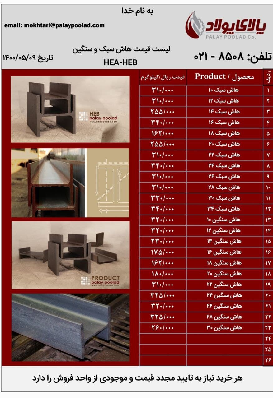 هاش 14 سبک طول 12 متری(290کیلو) هاش 14 سنگین طول 12 متری (400کیلو) هاش 16 سبک طول 12 متری (360کیلو) هاش 16 سنگین طول 12 متری (510کیلو) هاش 18 سبک طول 12 متری (430کیلو) هاش 18 سنگین طول 12 متری (620کیلو) هاش 20 سبک طول 12 متری (510کیلو) هاش 20 سنگین طول 12 متری (750کیلو) هاش 22 سبک طول 12 متری (606کیلو) هاش 28 سبک طول 12 متری (917کیلو) هاش 40 سبک طول 12 متری(1500کیلو) هاش 45 سنگین طول 12 متری(2050کیلو) هاش 50 سبک طول 12 متری(1860کیلو) ⚪️⚪️باتایید 🔴🔴(میثم عبداله وند)داخلی 122-123 🟡🟡(خانم فردی)داخلی 124-125 🟣🟣(مهدی فراهانی )داخلی 126-127 ☎️021-62999046 📲0912-1784270