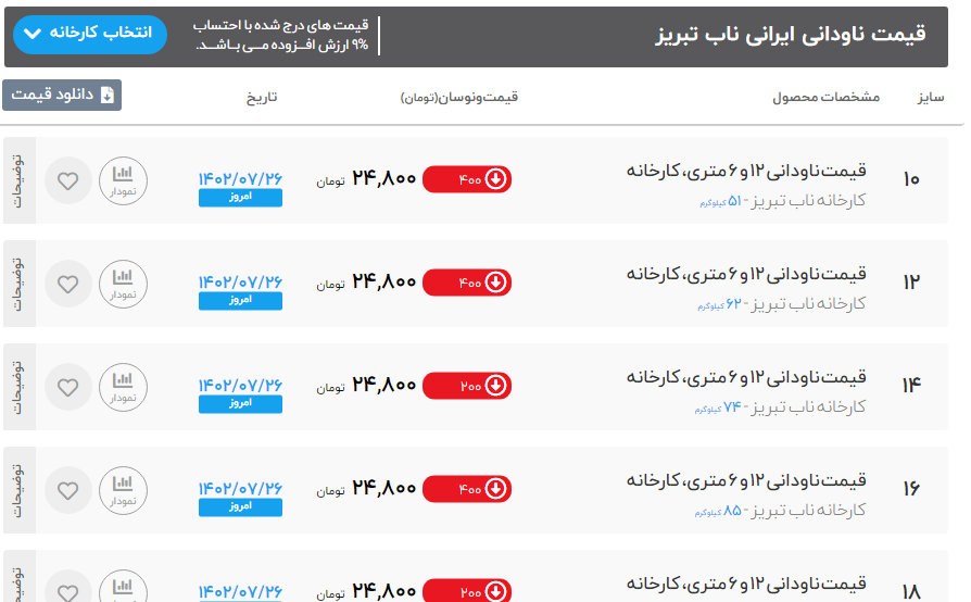 📆 تاریخ ⬅️ چهار شنبه 26 مهر ماه 1402 🚚 بارگیری ⬅️از کارخانه 〽️تغییرات قیمت ⬅️ ثابت ناودانی 2*4 ضخامت 5 (17 کیلوگرم) ⬅️ 29500 تومان ناودانی 2.5*5 ضخامت 5 (24 کیلوگرم) ⬅️ 28000 تومان ناودانی 6*3 ضخامت 6 (32 کیلوگرم) ⬅️ - تومان ❗️تمامی قیمت با احتساب 9% مالیات بر ارزش افزوده می باشد. ☑️ برای مشاوره و راهنمایی در مورد خرید لطفا با ما تماس بگیرید . ☎️ 02146132136 ☎️ 02146135390 📱09122887687 📱09107678174 🆔 @tgfonline