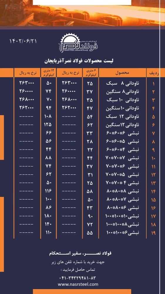 🔸 ناودانی ۸سبک:۲۶۳۰۰۰﷼ 🔸 ناودانی ۱۰سبک: ۲۶۸۰۰۰۰﷼ 🔸 ناودانی ۸سنگین : ۲۶۰۰۰۰﷼ 🔸 ناودانی ۱۰ سنگین: ۲۶۲۰۰۰﷼