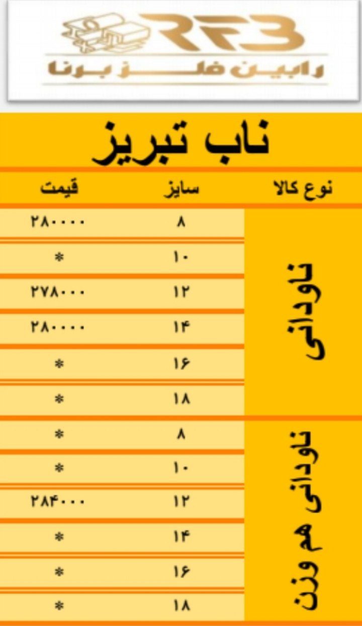 #آهن_آلات_ماح 🏗 قوطی و پروفیل ضخامت 2 ⬅️ 37000 تومان ضخامت 2.5 ⬅️ 36200 تومان ورق 2 میل 1*2 ⬅️ 38500 تومان —————————————— قوطی 3*2 ⬅️ 50 + قوطی 2*2 ⬅️ 100 + قوطی 1*2 ⬅️ 150 + لوله داربستی 2 میل ⬅️ 37000 تومان لوله داربستی 2/5 میل ⬅️ 36200 تومان انواع ستونی ⬅️ 35500 تومان 🏗 تسمه کوره تسمه 2 سانتی ⬅️ 28700 تومان تسمه 2.5 سانتی⬅️ 28700 تومان تسمه 3 سانتی ⬅️ 28700 تومان تسمه 4 سانتی ⬅️ 28700 تومان تسمه 5 سانتی ⬅️ 28700 تومان 🏗 سپری آهنی سپری آهنی 4 سبک وزن⬅️ 29500 تومان سپری آهنی 5 سبک وزن⬅️ 29500 تومان سپری آهنی 4 ⬅️ 29000 تومان سپری آهنی 5 ⬅️ 29000 تومان 🏗 ناودانی ناودانی 8 فوق سبک⬅️ 30000 تومان ناودانی 10 فوق سبک⬅️ 30000 تومان ناودانی 8 ⬅️ 29500 تومان ناودانی 10 ⬅️ 29500 تومان ناودانی 12 ⬅️ 29500 تومان ناودانی 14 ⬅️ 29500 تومان ناودانی 16 ⬅️ 29500 تومان ☎️03135540353 ☎️03135540365 📲09134401840 📲09101182756 اصفهان پل تمدن 🆔 https://t.me/ahan_mah_shojaii 🌐 foolad24.com/profile/14589