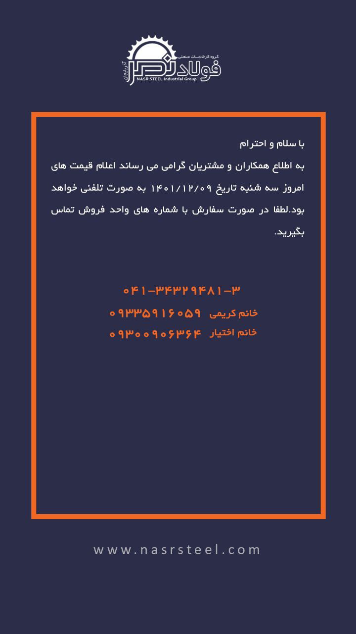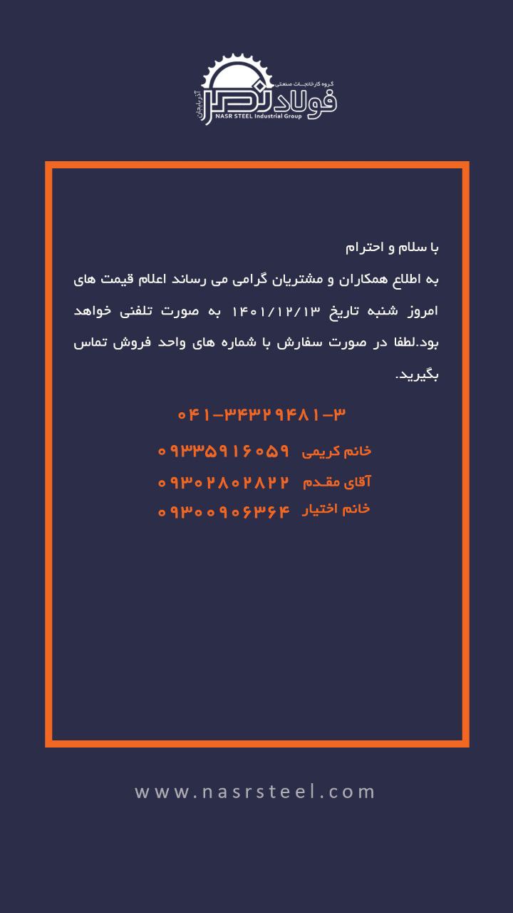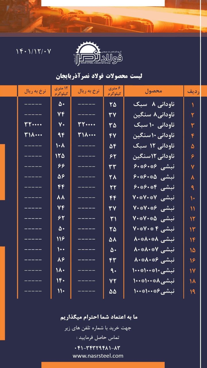 گروه کارخانجات #فولاد_نصر_آذربایجان📌تولید کننده انواع ناودانی ، نبشی و تیرآهن با استاندارد های روز دنیا 📌صادر کننده نمونه استانی📍آدرس کارخانه : تبریز ، جاده آذرشهر ، شهرک صنعتی سلیمی📌تلفن های دپارتمان فروش:☎️04134329481 ☎️04134329482 ☎️04134329483 📱09129308689 📱09144199362🆔https://t.me/NasrsteelAZ 📌https://www.instagram.com/nasrsteel 🌐nasrsteel.com https://foolad24.com/profile/12247