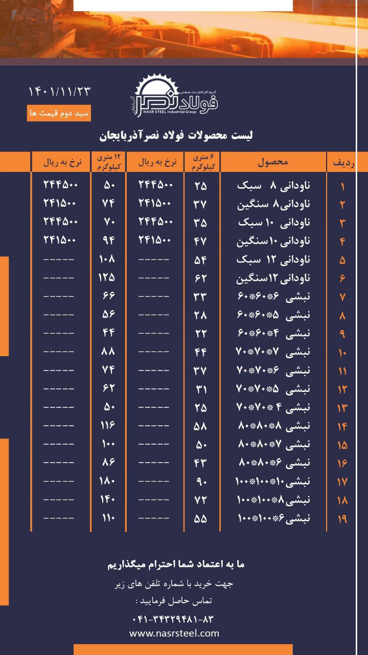 گروه کارخانجات #فولاد_نصر_آذربایجان📌تولید کننده انواع ناودانی ، نبشی و تیرآهن با استاندارد های روز دنیا 📌صادر کننده نمونه استانی📍آدرس کارخانه : تبریز ، جاده آذرشهر ، شهرک صنعتی سلیمی📌تلفن های دپارتمان فروش:☎️04134329481 ☎️04134329482 ☎️04134329483 📱09129308689 📱09144199362🆔https://t.me/NasrsteelAZ 📌https://www.instagram.com/nasrsteel 🌐nasrsteel.com https://foolad24.com/profile/12247