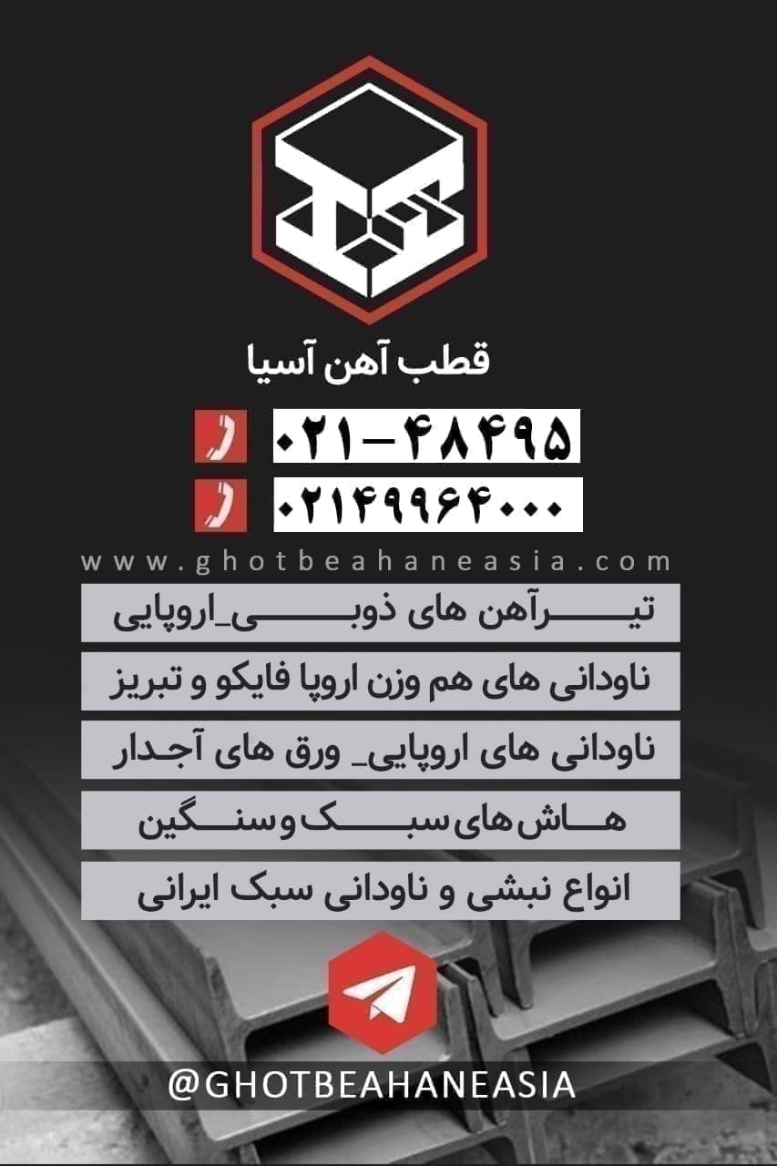 https://t.me/ahanmakanbot/672 ⭐️⭐️⭐️⭐️⭐️⭐️⭐️⭐️⭐️⭐️⭐️ #برشكاري #نبشي #ناوداني #انبار_تهران 🔹نبشي ٣ ابعادي 🔹نبشي ٤ ابعادي 🔹نبشي ٥ ابعادي 🔹نبشي ٦ ابعادي 🔹نبشي ٨ ابعادي 🔹نبشي ١٠ ابعادي 🔹نبشي ١٢ ابعادي 🔹نبشي ١٥ ابعادي 🔹ناوداني ٦ ابعادي 🔹ناوداني ٨ ابعادي 🔹ناوداني ١٠ ابعادي 🔹ناوداني ١٢ ابعادي 🔹ناوداني ١٤ ابعادي 🔹ناوداني ١٦ ابعادي ✅كليه محصولات طبق سفارش دلخواه برش داده ميشود ❌قيمت تلفني ۰۲۱۵۵۵۰۸۰۰۲ https://t.me/ahanmakanbot