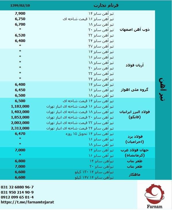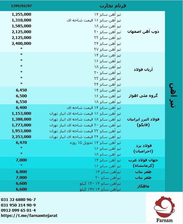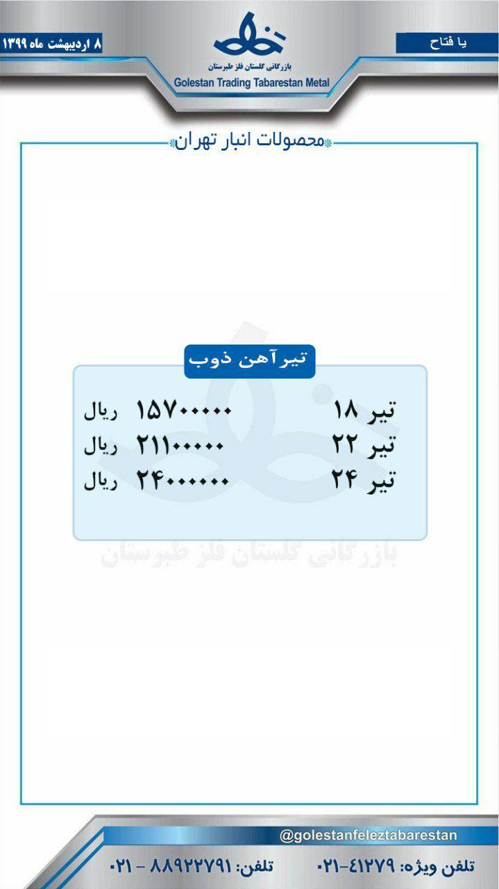 #تيرآهن #IPE #ذوب_آهن #انبار_تهران تيرآهن ١٢ ____ ۹/۶۰۰/۰۰۰ تيرآهن ١٤ ____ ۱۲/۶۰۰/۰۰۰ تيرآهن ١٦ ____ ۱۳/۲۰۰/۰۰۰ تيرآهن ١٨ ____ ۱۵/۷۰۰/۰۰۰ تيرآهن ٢٠ ____ ۱۹/۲۰۰/۰۰۰ تيرآهن ٢٢ ____ ۲۱/۰۰۰/۰۰۰ تيرآهن ٢٤ ____ ۲۴/۰۰۰/۰۰۰ تيرآهن ٢٧ ____ ۳۰/۳۰۰/۰۰۰ تيرآهن ٣٠ ____ ۳۸/۹۰۰/۰۰۰ قیمتها با تایید میباشد ۰۲۱۶۶۹۱۱۰۰۷