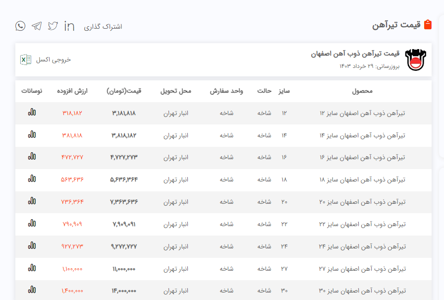 📆 سهشنبه 08 خرداد ماه 1403 #تیرآهن_ذوبآهن اصفهان - بارگیری از انبار تهران 12 ⬅️ 4100000 تومان 14 ⬅️ 4820000 تومان 16 ⬅️ 5820000 تومان 18 ⬅️ 6820000 تومان 20 ⬅️ 8500000 تومان 22 ⬅️ 9850000 تومان 24 ⬅️ 10700000 تومان 27 ⬅️ 12700000 تومان 30 ⬅️ 16200000 تومان 🔺 50 الی 170 هزار تومان افزایش نسبت به آخرین نرخ اعلامی روز گذشته ✅مشاوره و ارتباط با کارشناسان فروش: #آهن آرسام ☎️ 09337494534 ☎️ 09939481108 واتساپ و روبیکا: 09337494534 وبسایت: Www.arsam24.ir لینک تلگرام: https://t.me/ARSSAM24