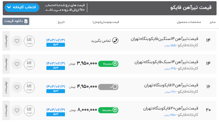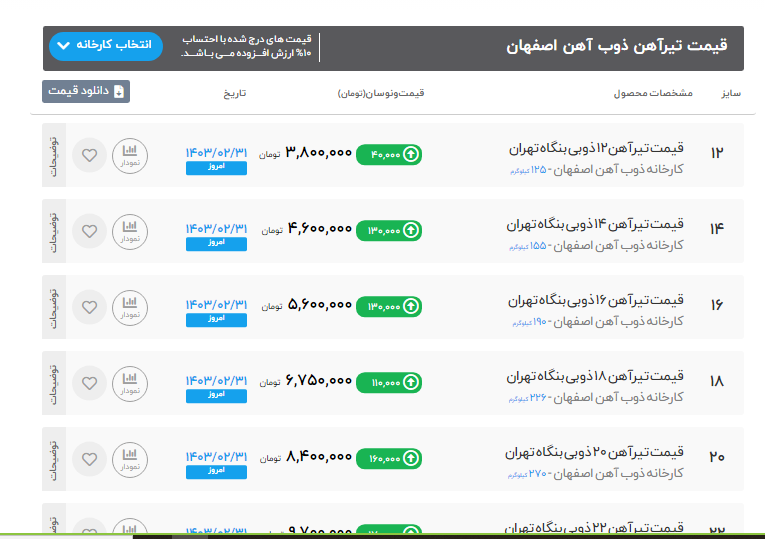 تیرآهن کیلویی ذوب_آهن_اصفهان انبار_ سایز۱۲: ۳۰۷.۰۰۰ریال سایز۱۴: ۲۹۲.۰۰۰ ریال سایز۱۶: ۲۸۸،۰۰۰ ریال سایز۱۸: ۲۹۰،۰۰۰ ریال سایز۲۰: ۳۱۰،۰۰۰ ریال سایز۲۲: ۲۹۰،۰۰۰ ریال سایز۲۴: ۲۹۰،۰۰۰ ریال سایز۲۷: ۲۹۰،۰۰۰ ریال سایز۳۰: ۳۲۰،۰۰۰ ریال