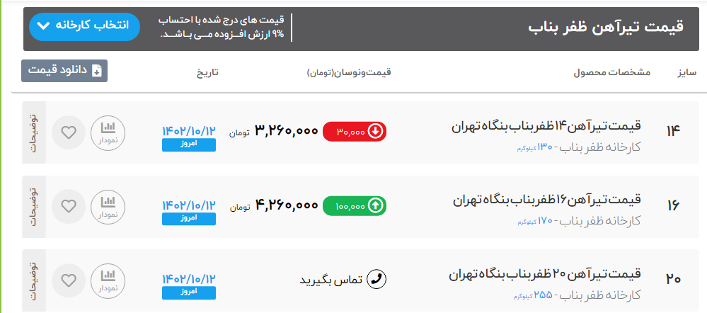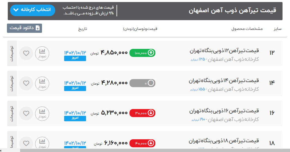 🗓 امروز سهشنبه ۱۲ دی ماه ۱۴۰۲ ✅قیمت انوع محصولات فولادی (بنگاه اصفهان) ✅قیمت ها با تایید میباشد. (انبار آهن آلات پورجم با باسکول تمام. الکترونیک 60تنی) راه های ارتباطی با ما : ☎️ 0314202 ☎️ 03133869211 ☎️ 03133869212 تیر آهن ذوب آهن 12 50,000,000 تیر آهن ذوب آهن 14 43,000,000 تیر آهن ذوب آهن 16 52,000,000 تیر آهن ذوب آهن 18 62,000,000 تیر آهن ذوب آهن20 83,000,000 تیر آهن ذوب آهن22 99,000,000 تیر آهن ذوب آهن24 114,000,000 تیر آهن ذوب آهن27 130,000,000 تیر آهن ذوب آهن30 162,000,000 ✅ کلیه محصولات، بارگیری سریع، آماده ارسال
