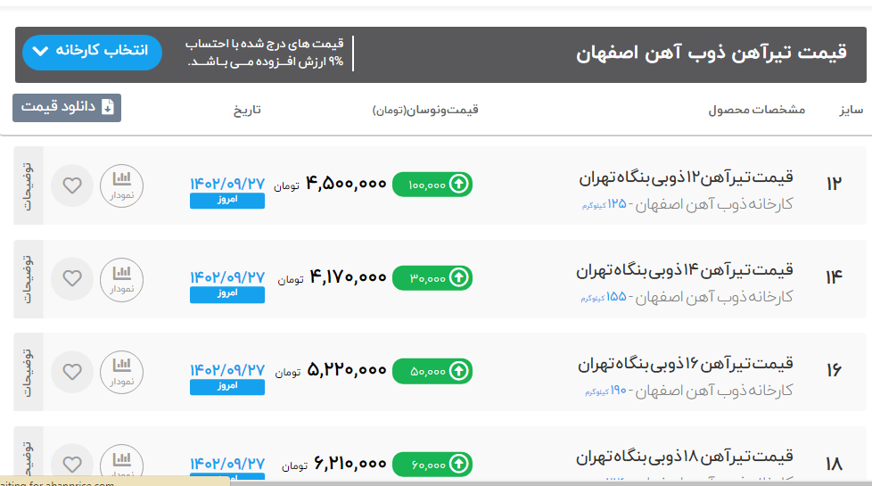 آهن آلات اخوان بندعلی 33701962: انبارتهران قیمت تیرآهن تیرآهن 12ذوبی: 44.000.000 تیرآهن 14ذوبی: 42.000.000 تیرآهن 16ذوبی: 52.200.000 تیرآهن 18ذوبی: 62.300.000 تیرآهن 20ذوبی: 77.000.000 تیرآهن 22ذوبی:95.000.000 تیرآهن 24ذوبی:106.000.000 تیرآهن 27ذوبی:121.000.000 تیرآهن 30ذوبی:139.000.000 تیرآهن 14سبک : 00000000 تیرآهن 16سبک : 00000000 تیرآهن 18سبک : 00000000 تیرآهن 20سبک : 00000000 تیرآهن 14 یزدی: 34.500.000 تیرآهن 16 یزدی: 43.200.000 تیرآهن 18 یزدی 53.000.000 تیرآهن 20 یزدی: 000000000 تیرآهن 22 یزدی: 77.000.000 تیرآهن 24 یزدی: 92.500.000 . تیرآهن 14 فایکو: 36.500.000 تیرآهن 16 فایکو: 44.300.000 تیرآهن 18 فایکو:55.500.000 تیرآهن 20 فایکو:000000000 تیرآهن 22 فایکو: 80.500.000 تیرآهن 24 فایکو: 95.000.000 تیر 14 ظفربناب: 32.700.000 تیر 14اطلس: 29.400.000 تیر 14 ماهان: 29.000.000 تیر 14کرمانشاه30.200.000 تیر 16ظفربناب: 41.000.000 تیرآهن 14اهواز 32.600.000 تیرآهن 16اهواز 40.800.000