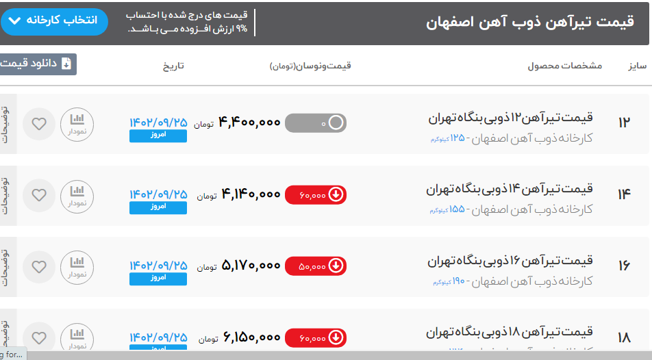 🗓️شنبه 1402/09/25 ☑️تیرآهن ذوب آهن 📍سایز 14 ⬅️ 4.180.000 تومان 📍سایز 16 ⬅️ 5.280.000 تومان 📍سایز 18 ⬅️ 6.180.000 تومان 📍سایز 20 ⬅️ 7.630.000 تومان 📍سایز 22 ⬅️ 9.730.000 تومان 📍سایز 24 ⬅️ 10.830.000 تومان 📍سایز 27 ⬅️ 11.930.000 تومان 📍سایز 30 ⬅️ 13.830.000 تومان 🚚بارگیری از انبار اصفهان 🏗️شرکت فولاد سعادت پاسارگاد (اصفهان) 031_35493211 09136021271 ☎️