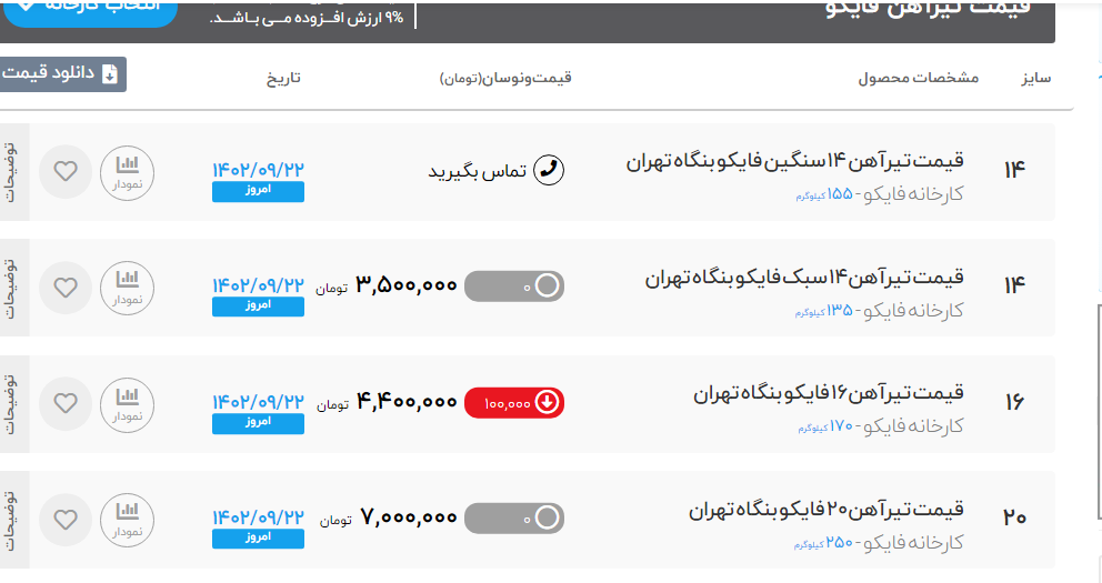 🌼🌼به نام خدا🌼🌼 1402/09/22 🔴لیست موجود درب مغازه 🟡تیرآهن اصفهان تيراهن 12 اصفهان (۱۳۰کیلو) 4550 تيراهن 14 اصفهان (۱۵۵کیلو) 4250 تيراهن 16 اصفهان (١٩٠کیلو) 5250 تيراهن 18 اصفهان (٢٣٠کیلو) 6250 تيراهن 20 اصفهان (۲۷۲كیلو) 7850 تيراهن 22 اصفهان (٣٢٠كیلو) 9850 تيراهن 24 اصفهان (٣٧٥كیلو) 10650 تيراهن 27 اصفهان (٤٤٠كیلو) 12000 تيراهن 30 اصفهان (٥١٠كیلو) 13900 🟡تیرآهن متفرقه تيراهن 14 ماهان (١۱۰كیلو) 3150 تيراهن 14 اهواز (١۳۱كیلو) 3350 تیراهن 16 اهواز (۱۶۸کیلو) 4250 تيراهن 18 فایکو (۲۰۸کیلو) 5400 تیراهن 20 فایکو (۲۵۱کیلو) —— تیراهن 22 یزدی (۳۰۰کیلو) 7750 تیراهن 24 یزدی (۳۵۰کیلو) 9000 تلفن: 66317671 آدرس مجموعه:تهران،بازار آهن شاد آباد مجتمع بهاران۲ بلوک ۳۳ پلاک ۱۰۰