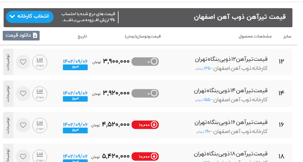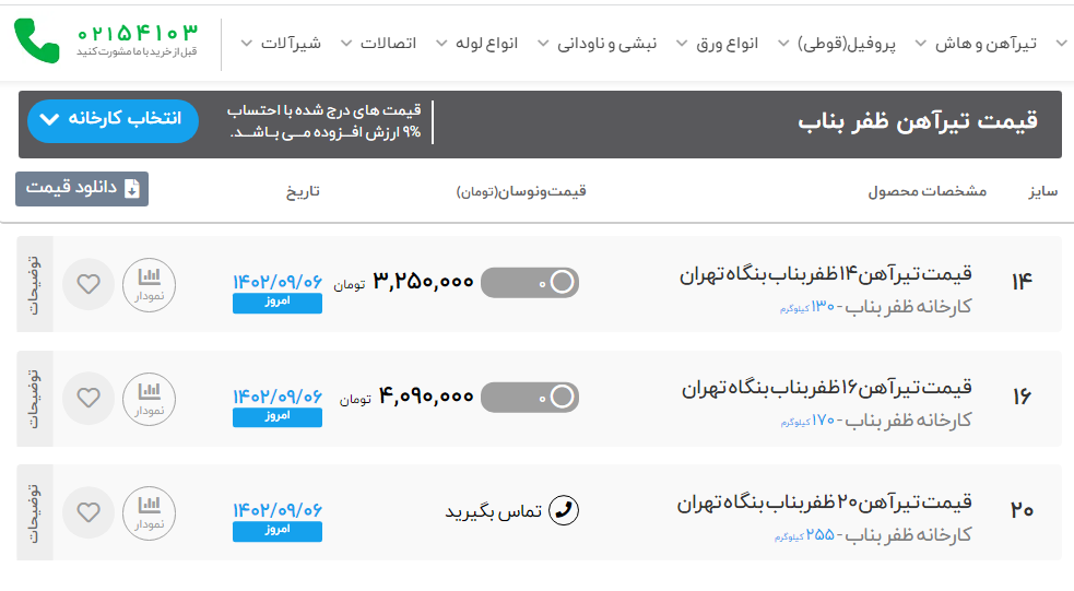 بِسْمِ اللّٰهِ الرَّحْمٰنِ الرَّحیٖم #وب_آهن 1402.09.06 #تیر_ذوب_انبار_تهران #انبار_تهران ✅🔴 قيمت نهايي و نحوه تسويه توافقي 🔴✅ تیر 12 ذوب 120 کیلو 3900 تیر 14 ذوب 155 کیلو 3920 تیر 16 ذوب 190 کیلو 4530 تیر 18 ذوب 230 کیلو 5420 تیر 20 ذوب 270 کیلو 7110 تیر 22 ذوب 320 کیلو 8060 تیر 24 ذوب 370 کیلو 9260 تیر 27 ذوب 430 کیلو 10750 تیر 30 ذوب 500 کیلو 12950 #انبار_تهران ✅🔴قيمت نهايي و نحوه تسويه توافقي 🔴✅ ╭━━═━⊰✹🏗✹⊱━═━━━╮ 🌐 https://webahan.com 🌐 🆔@webahan🆔 ☎️ 021-532 36 ☎️ ☎️ 021-548 57000 ☎️ ╰━━═━⊰❀🏗❀⊱━═━━━╯