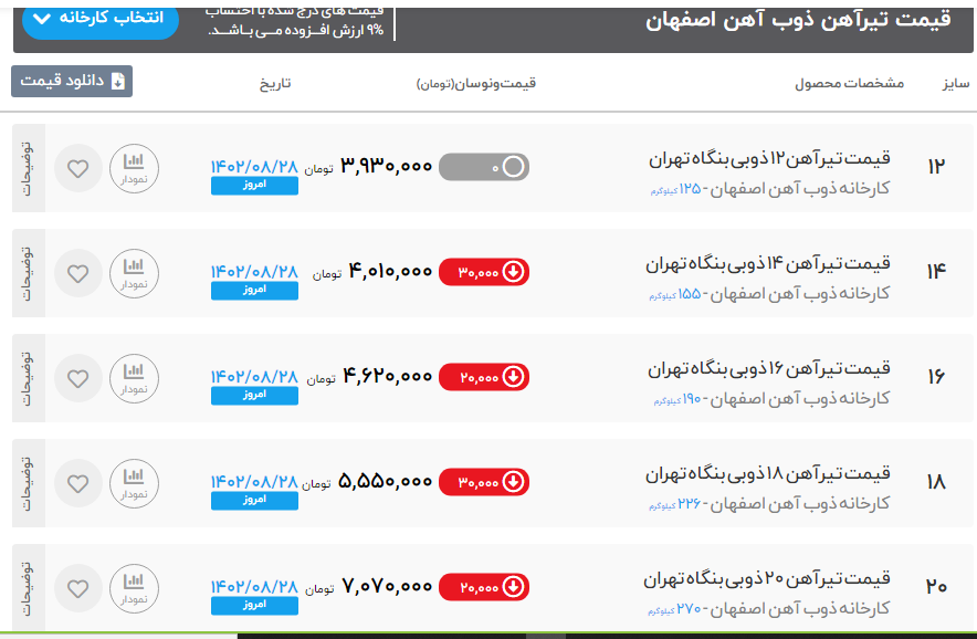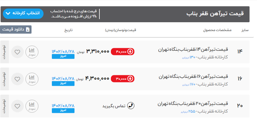 تیرآهن۱۴بناب 3300000 تیرآهن۱۴ماهان 2960000 تیرآهن ۱۴اطلس 2950000 تیرآهن۱۴کرمانشاه 3040000