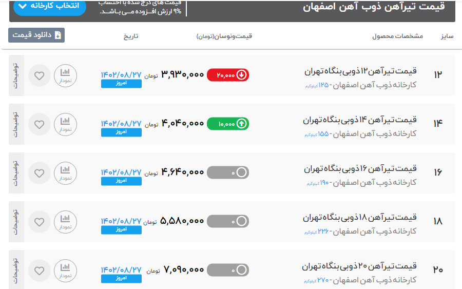 #قیمت #تیرآهن #فایکو 🌎 شنبه 27 آبان ماه 1402 🌎 تیرآهن 14 ⏪ 34500000 ریال تیرآهن 16 ⏪ 44000000 ریال تیرآهن 18 ⏪ 54000000 ریال تیرآهن 20 ⏪ 66000000 ریال تیرآهن 22 ⏪ 77000000 ریال تیرآهن 24 ⏪ 91000000 ریال ✅تهران آهن خریدی امن,آسان,ارزان ✅کارشناس فروش : آقای قاجار 🔴 (https://tehran-ahan.com/)مشاهده قیمت تیرآهن فایکو (https://tehran-ahan.com/product-category/faico-beams/?utm_source=telegram&utm_medium=social&utm_campaign=faico-beams) 🔴 (https://tehran-ahan.com/)⚙️برای مشاهده کامل جدول قیمت تیرآهن می توانید به سایت تهران آهن مراجعه کنید: ✅ (50 خط ویژه): ☎️021-86073000 📱 instagram.com/tehran.ahan 🌏 https://b2n.ir/p70862 🔗 t.me/Tehran_ahan