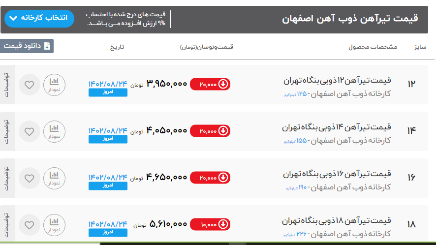🟢 قیمت روز تیرآهن ذوب آهن انبار اصفهان #تیرآهن_ذوب_آهن_انبار | تاریخ بروزرسانی: ۱۴۰۲/۰۸/۲۴ شاخه ای تیرآهن 12 ذوب آهن اصفهان (https://moshaveranahan.com/product/%d8%aa%db%8c%d8%b1%d8%a2%d9%87%d9%86-12-%d8%b0%d9%88%d8%a8-%d8%a2%d9%87%d9%86-%d8%a7%d8%b5%d9%81%d9%87%d8%a7%d9%86-2/) | 3,577,000 تومان ------------------------------ تیرآهن 14 ذوب آهن اصفهان (https://moshaveranahan.com/product/%d8%aa%db%8c%d8%b1%d8%a2%d9%87%d9%86-14-%d8%b0%d9%88%d8%a8-%d8%a2%d9%87%d9%86-%d8%a7%d8%b5%d9%81%d9%87%d8%a7%d9%86-2/) | 3,715,000 تومان ------------------------------ تیرآهن 16 ذوب آهن اصفهان (https://moshaveranahan.com/product/%d8%aa%db%8c%d8%b1%d8%a2%d9%87%d9%86-16-%d8%b0%d9%88%d8%a8-%d8%a2%d9%87%d9%86-%d8%a7%d8%b5%d9%81%d9%87%d8%a7%d9%86-2/) | 4,220,000 تومان ------------------------------ تیرآهن 18 ذوب آهن اصفهان (https://moshaveranahan.com/product/%d8%aa%db%8c%d8%b1%d8%a2%d9%87%d9%86-18-%d8%b0%d9%88%d8%a8-%d8%a2%d9%87%d9%86-%d8%a7%d8%b5%d9%81%d9%87%d8%a7%d9%86-2/) | 5,137,000 تومان ------------------------------ تیرآهن 20 ذوب آهن اصفهان (https://moshaveranahan.com/product/%d8%aa%db%8c%d8%b1%d8%a2%d9%87%d9%86-20-%d8%b0%d9%88%d8%a8-%d8%a2%d9%87%d9%86-%d8%a7%d8%b5%d9%81%d9%87%d8%a7%d9%86-2/) | 6,605,000 تومان ------------------------------ تیرآهن 22 ذوب آهن اصفهان (https://moshaveranahan.com/product/%d8%aa%db%8c%d8%b1%d8%a2%d9%87%d9%86-22-%d8%b0%d9%88%d8%a8-%d8%a2%d9%87%d9%86-%d8%a7%d8%b5%d9%81%d9%87%d8%a7%d9%86-2/) | 7,522,000 تومان ------------------------------ تیرآهن 24 ذوب آهن اصفهان (https://moshaveranahan.com/product/%d8%aa%db%8c%d8%b1%d8%a2%d9%87%d9%86-24-%d8%b0%d9%88%d8%a8-%d8%a2%d9%87%d9%86-%d8%a7%d8%b5%d9%81%d9%87%d8%a7%d9%86-2/) | 8,486,000 تومان ------------------------------ تیرآهن 27 ذوب آهن اصفهان (https://moshaveranahan.com/product/%d8%aa%db%8c%d8%b1%d8%a2%d9%87%d9%86-27-%d8%b0%d9%88%d8%a8-%d8%a2%d9%87%d9%86-%d8%a7%d8%b5%d9%81%d9%87%d8%a7%d9%86-2/) | 9,954,000 تومان ------------------------------ تیرآهن 30 ذوب آهن اصفهان (https://moshaveranahan.com/product/%d8%aa%db%8c%d8%b1%d8%a2%d9%87%d9%86-30-%d8%b0%d9%88%d8%a8-%d8%a2%d9%87%d9%86-%d8%a7%d8%b5%d9%81%d9%87%d8%a7%d9%86-2/) | 12,018,000 تومان ☎️ 03191091009 🔵🟠 @moshaveranahan