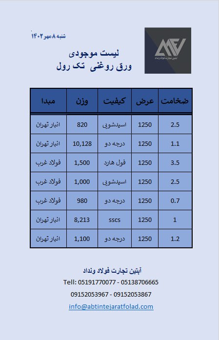 شرکت اهن فارس ورق گرم (سیاه), ورق روغنی (سرد), ورق گالوانیزه, ورق اسید شویی