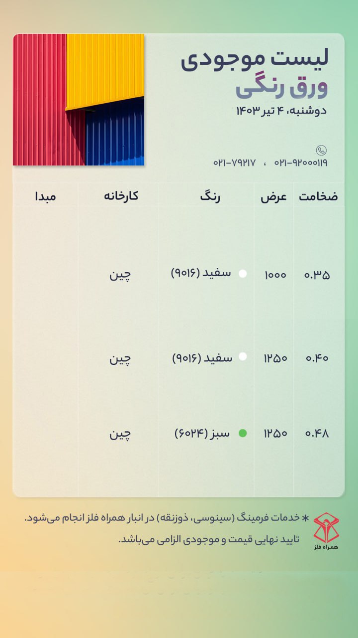 #فولاد_کبیر 🔤🔤🔤🔤🔤➖🔤🔤🔤🔤🔤 📆 04 تیر 1403 📢لیست موجودی ورقهای رنگی موجودی رنگها⬇️ ✅ مشکی ، چین ، 0/47 ، 1250 ✅ طوسی ، هفتالماس ، 0/48 ، 1250 ضخیم بار⬇️ ✅ آبی ، هفتالماس ، 0/60 ، 1250 ✅ سفید ، هفتالماس ، 0/60 ، 1250 📌لینک قیمت بهروز ورقهایرنگی (https://sgkabir.com/products/coloredsheet/%D9%88%D8%B1%D9%82-%D8%B1%D9%86%DA%AF%DB%8C) 🗣 شرکت فولادکبیر (سهامیخاص) #جهت_مشاهده_پروفایل_فولاد_کبیر👇🏻 🔸https://foolad24.com/profile/9205 #جهت_مشاهده_اعلام_موجودی_فولاد_کبیر👇🏻 https://foolad24.com/profile/9205/inventory ☎️تلفن تماس: 021-58751 🔗لینک سایت: www.sgkabir.com 🔗لینک کانال تلگرام: https://t.me/sgkabirco 🟥🔗لينك گروه فولادوساختمان: https://t.me/kabirco1 ٫ ☎️021-58751 🌐 www.Sgkabir.com 🆔 https://www.instagram.com/sgkabirco/?hl=en