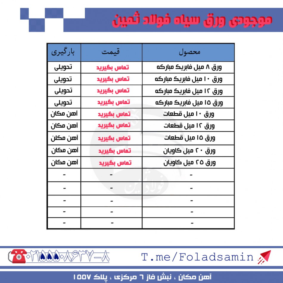 ورق گالوانيزه سمنان در كارخانه ٤٨ دو عرض ٨٠و٩٠و١ عرض١٢٥ ________________________________ ورق گالوانيزه الماس در كارخانه ٥٠ تا ٩٠ عرض١٢٥ ٢و٢/٥ دو عرض _______________________________ ورق رنگ انبار تهران ٢٣ قرمز و نارنج و پرتقال و سفال ٢٥ عرض١ سفيد ٢٨ عرض١ قرمز ٣٠ و٣٥ و ٤٠ عرض ١ سفيد ٤٧ عرض١ سفيد و قرمز و نارنج ٤٧ عرض١٢٥ قرمز ونارنج وسفيد و فهوه ا واب وپرتقال ٤٨ عرض١٢٥ فولاد قرمز وقهوه ا واب وسفيد و نارنج