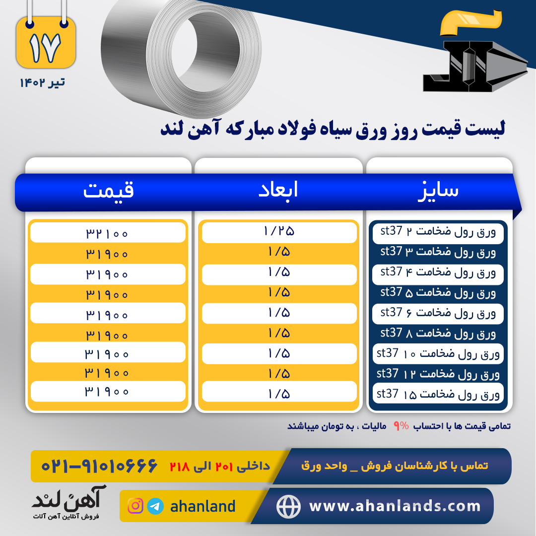 #سپهر_تک_کیمیا✅ورق ST37 مبارکه ورق3میل فولاد ۱۵۰*۶ ورق 4میل فولاد ۱۵۰*۶ ورق 5میل فولاد ۱۵۰*۶ ورق 6میل فولاد ۱۵۰*۶ ورق 8میل فولاد ۱۵۰*۶ ورق 10میل فولاد ۱۵۰*۶ ورق 12میل فولاد ۱۵۰*۶ ورق 15میل فولاد ۱۵۰*۶ ✅ورق A283-c مبارکه ورق ۶ میل فولاد ۱۵۰*۶ ورق ۸ میل فولاد ۱۵۰*۶ ورق ۱۰ میل فولاد ۱۵۰*۶ ورق ۱۲ میل فولاد ۱۵۰*۶ ورق ۱۵ میل فولاد ۱۵۰*۶ ✅ورق ST52 مبارکه ورق3میل فولاد ۱۵۰*۶ ورق 4میل فولاد ۱۵۰*۶ ورق 5میل فولاد ۱۵۰*۶ ورق 6میل فولاد ۱۵۰*۶ ورق 8میل فولاد ۱۵۰*۶ ورق 10میل فولاد ۱۵۰*۶ ورق 12میل فولاد ۱۵۰*۶ ورق 15میل فولاد ۱۵۰*۶ ✅ورق A516_70 ورق 12 میل. ۲*۶___۲*۱۲ ورق15 میل ۲*۶___۲*۱۲ ورق 20میل ۲*۶___۲*۱۲ ورق 25 میل ۲*۶___۲*۱۲ ورق 30میل ۲*۶___۲*۱۲ برای اطلاع از قیمت ها با شماره های زیر تماس حاصل فرمایید: ☎️021 _ 33933114 ☎️021 _ 33933218 ☎️021 _ 33932136 📱09125199007🆔https://t.me/sepehrtakkimiya 🌐https://foolad24.com/profile/660
