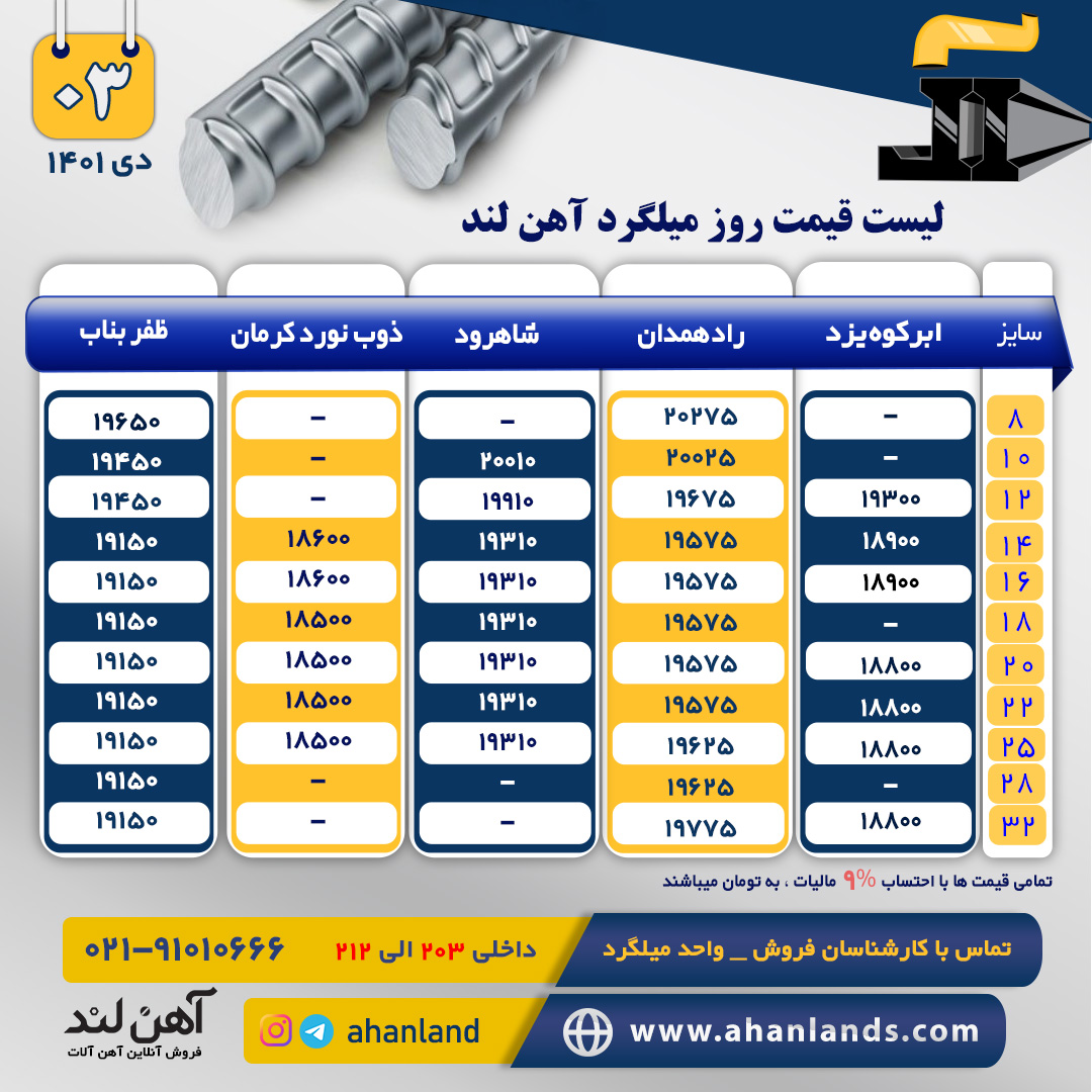 اعلام موجودی فلزات آلیاژی صورت بار فلزات آلیاژی لیست قیمت سوم دی ماه ۱۴۰۱ برای مشاهده آنلاین قیمت انواع مقاطع فولادی به وب سایت زیر مراجعه نمایید: WWW.AHANLANDS.COM ⚜اعتماد شما اعتبار ماست⚜ ارتباط با کارشناسان ما: https://zil.ink/ahanland 📍آدرس اینستاگرام آهن لند https://lnkd.in/d۴epHFt