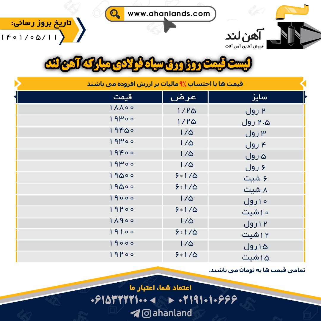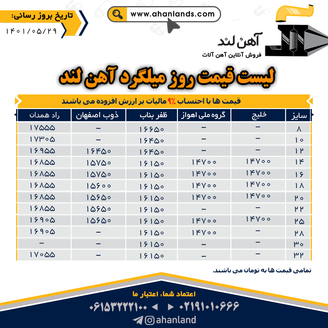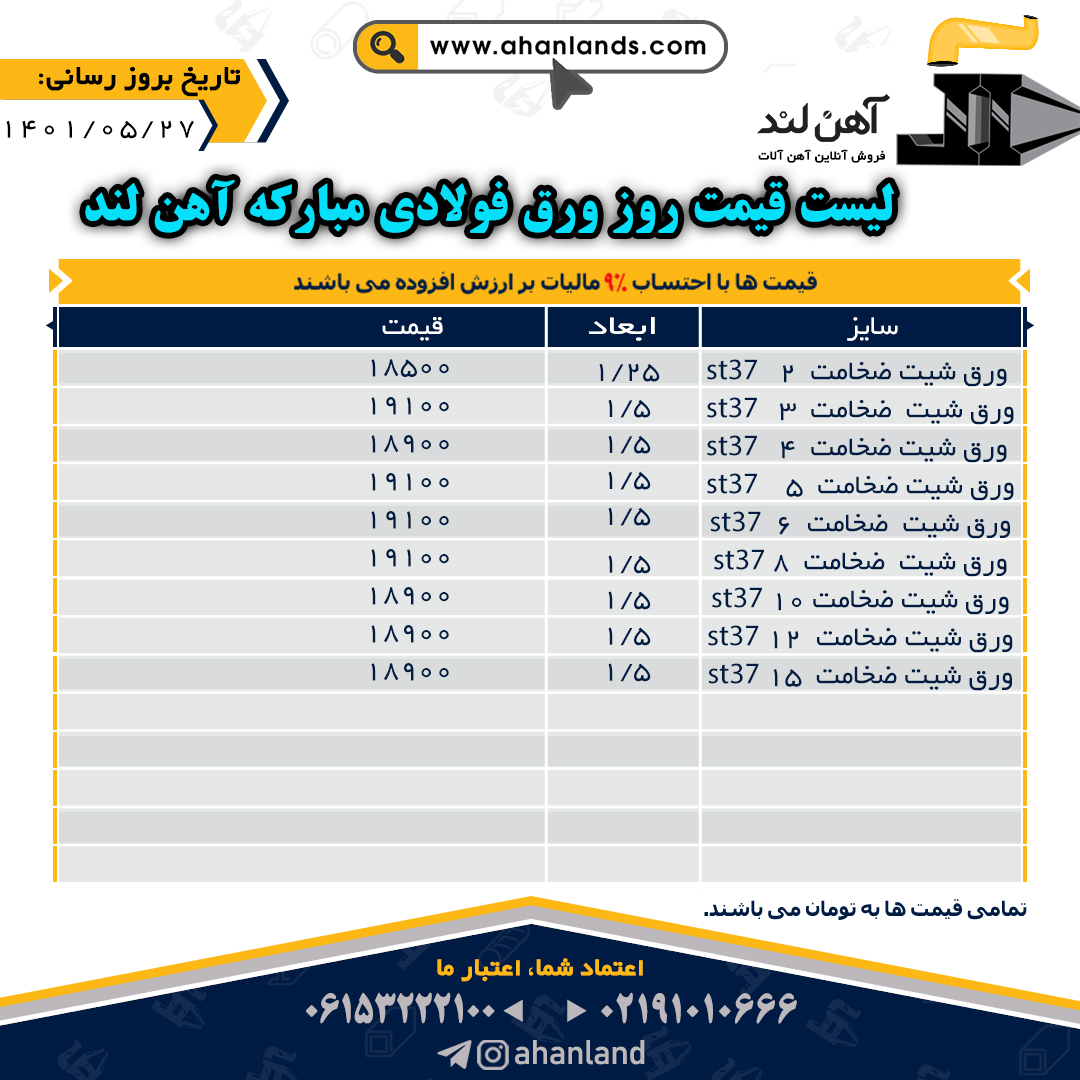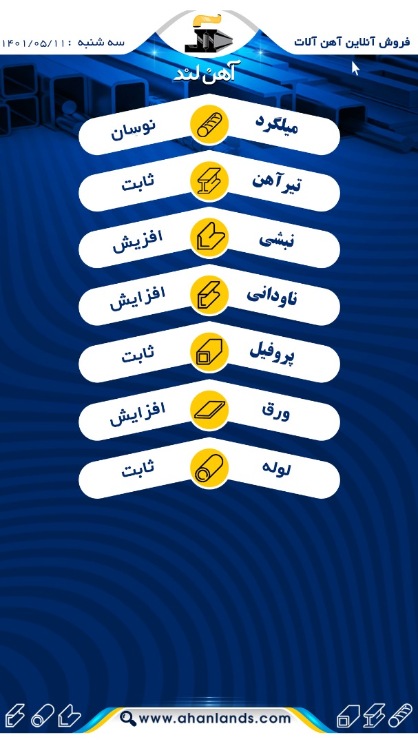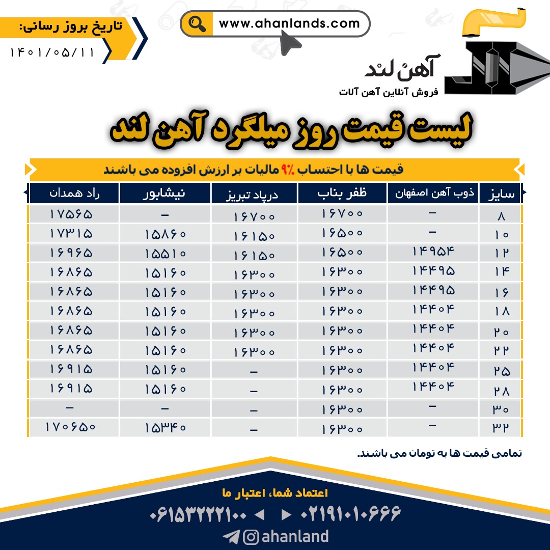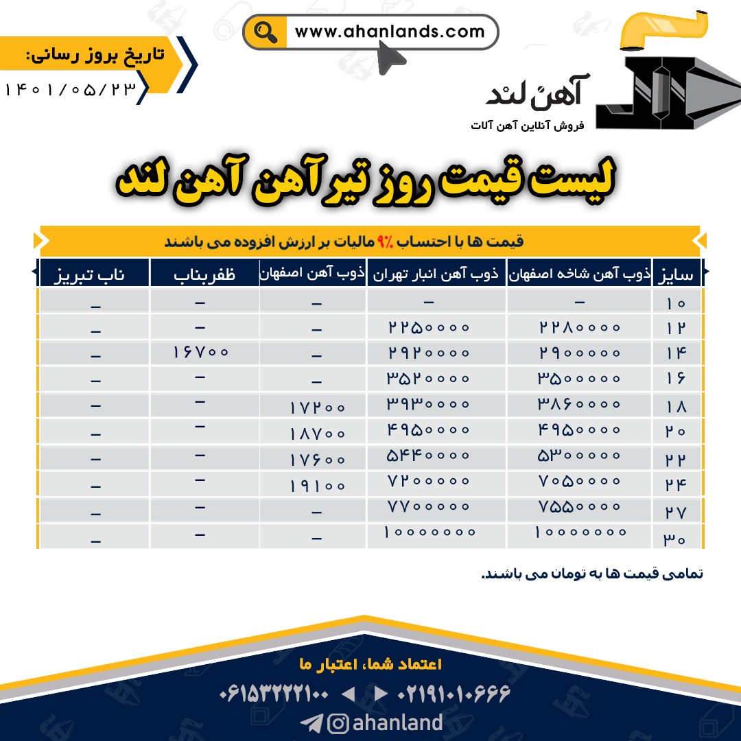 لیست قیمت یازدهم مرداد ۱۴۰۱ برای مشاهده آنلاین قیمت انواع مقاطع فولادی به وب سایت زیر مراجعه نمایید: WWW.AHANLANDS.COM ⚜اعتماد شما اعتبار ماست⚜ ارتباط با کارشناسان ما: https://zil.ink/ahanland 📍آدرس اینستاگرام آهن لند https://lnkd.in/d۴epHFt