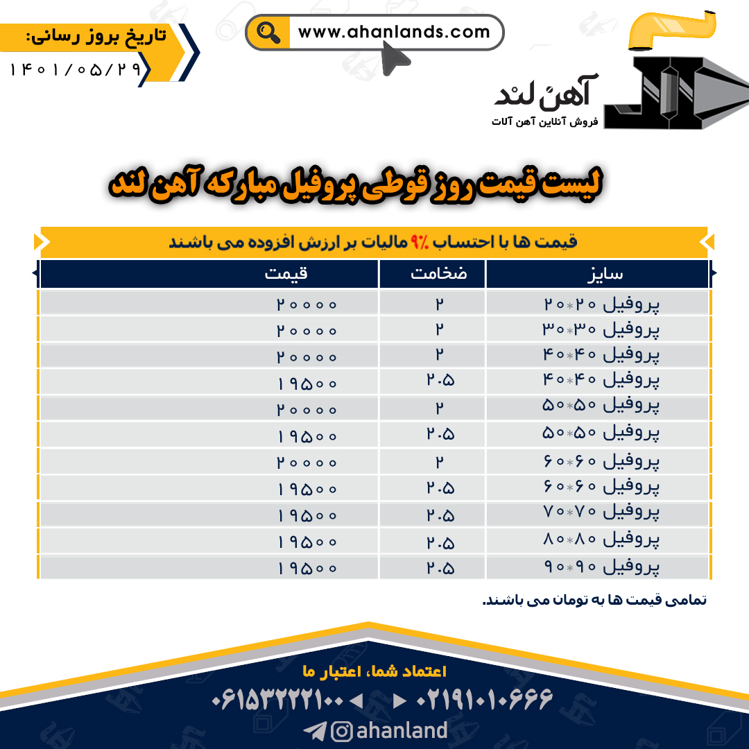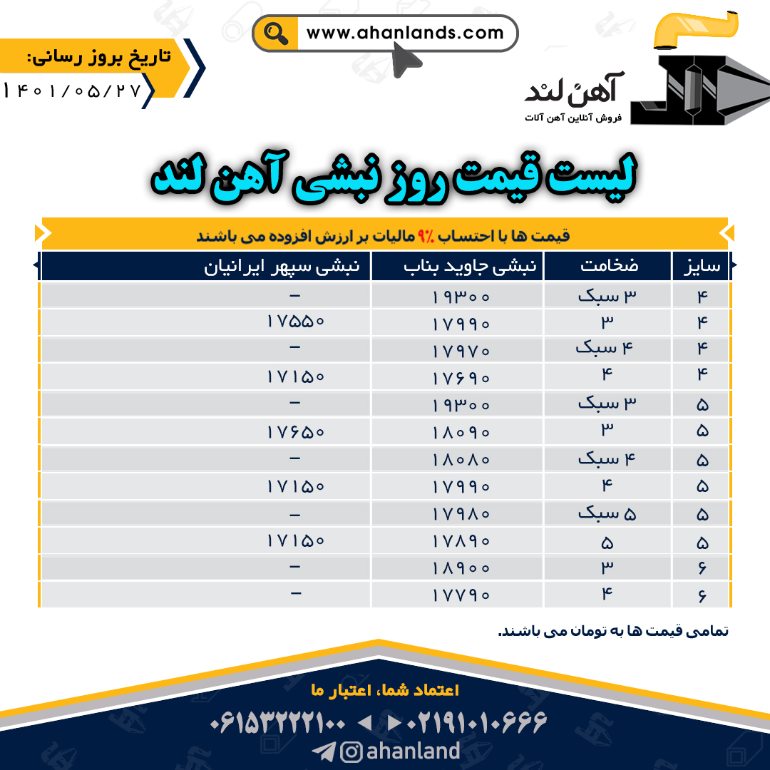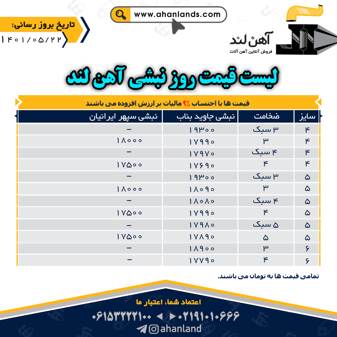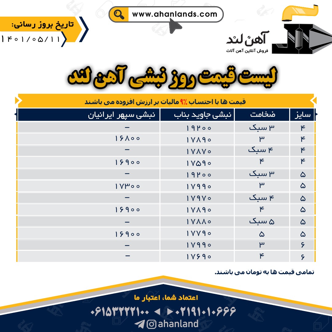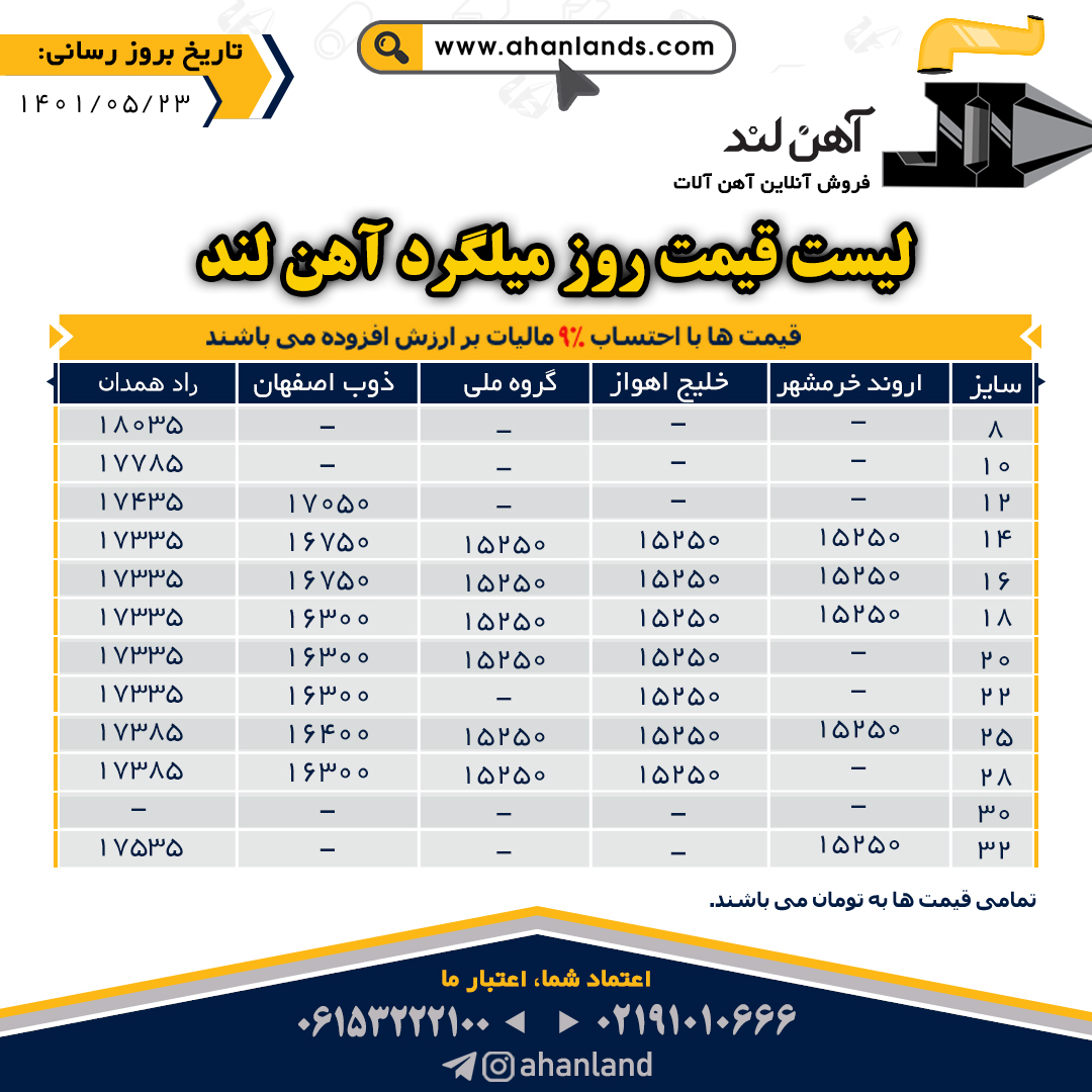 لیست قیمت یازدهم مرداد ۱۴۰۱ برای مشاهده آنلاین قیمت انواع مقاطع فولادی به وب سایت زیر مراجعه نمایید: WWW.AHANLANDS.COM ⚜اعتماد شما اعتبار ماست⚜ ارتباط با کارشناسان ما: https://zil.ink/ahanland 📍آدرس اینستاگرام آهن لند https://lnkd.in/d۴epHFt