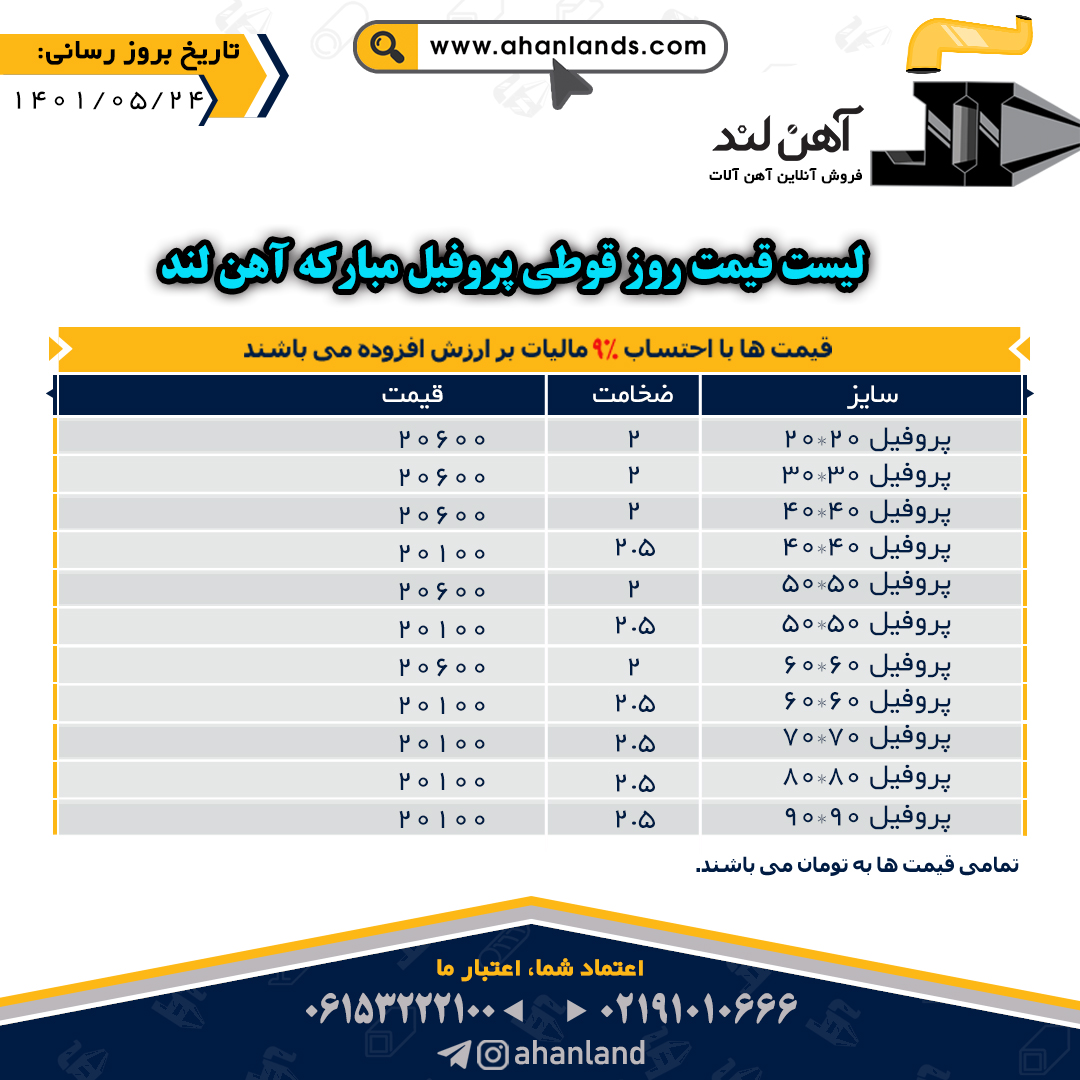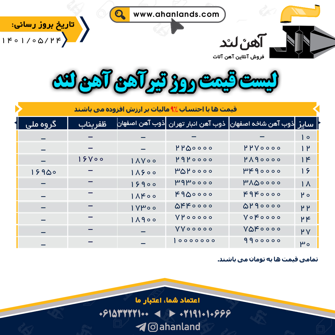 لیست قیمت بیست و چهارم مرداد ۱۴۰۱ برای مشاهده آنلاین قیمت انواع مقاطع فولادی به وب سایت زیر مراجعه نمایید: WWW.AHANLANDS.COM ⚜اعتماد شما اعتبار ماست⚜ ارتباط با کارشناسان ما: https://zil.ink/ahanland 📍آدرس اینستاگرام آهن لند https://lnkd.in/d۴epHFt