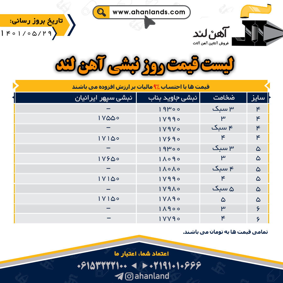 لیست قیمت بیست و نهم مرداد ۱۴۰۱ برای مشاهده آنلاین قیمت انواع مقاطع فولادی به وب سایت زیر مراجعه نمایید: WWW.AHANLANDS.COM ⚜اعتماد شما اعتبار ماست⚜ ارتباط با کارشناسان ما: https://zil.ink/ahanland 📍آدرس اینستاگرام آهن لند https://lnkd.in/d۴epHFt